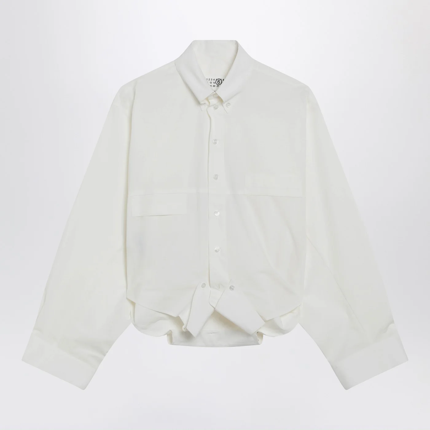 MM6 Maison Margiela shirt in white cotton poplin Mirrored construction with doubled and inverted panels Chest patch pockets Pointed button down collar Long sleeves with buttoned cuffs Front button fastening White stitch line on the back. Size and Fit – Model wears size 40 IT Model measurements: Height: 181 cm Chest: 81 cm Waist: 62 cm Hips: 89 cm