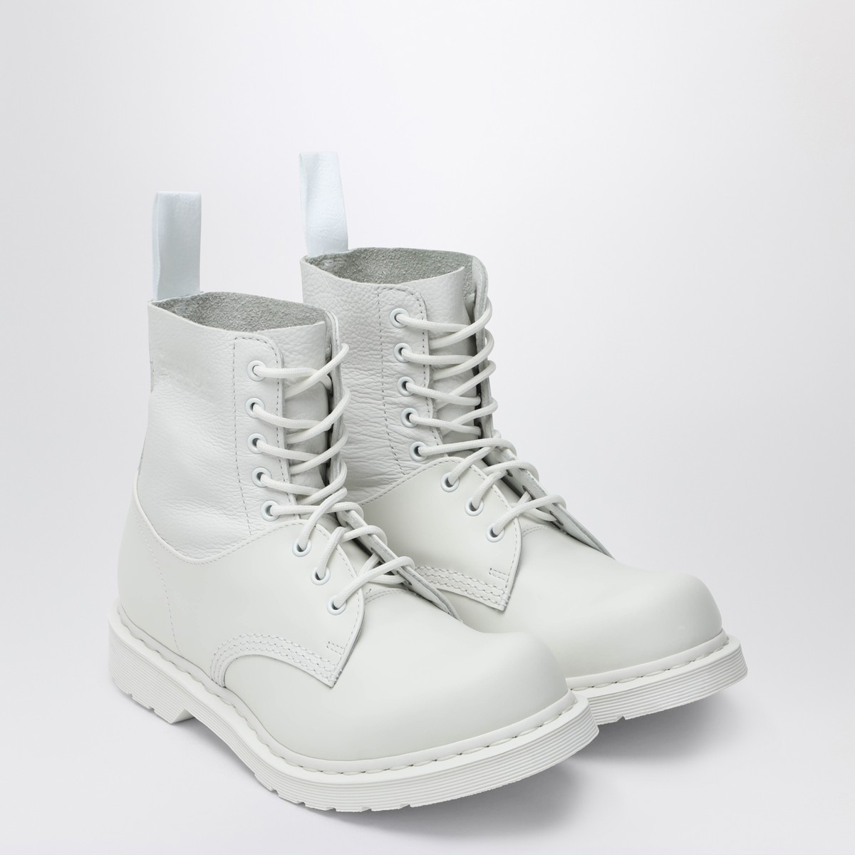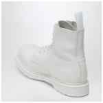 White leather lace-up boot from MM6 Maison Margiela in collaboration with Dr. Martens featuring a round toe, tonal stitching, a lace-up fastening, a rear pull tab, a Numeric Signature logo to the side and a rubber sole.