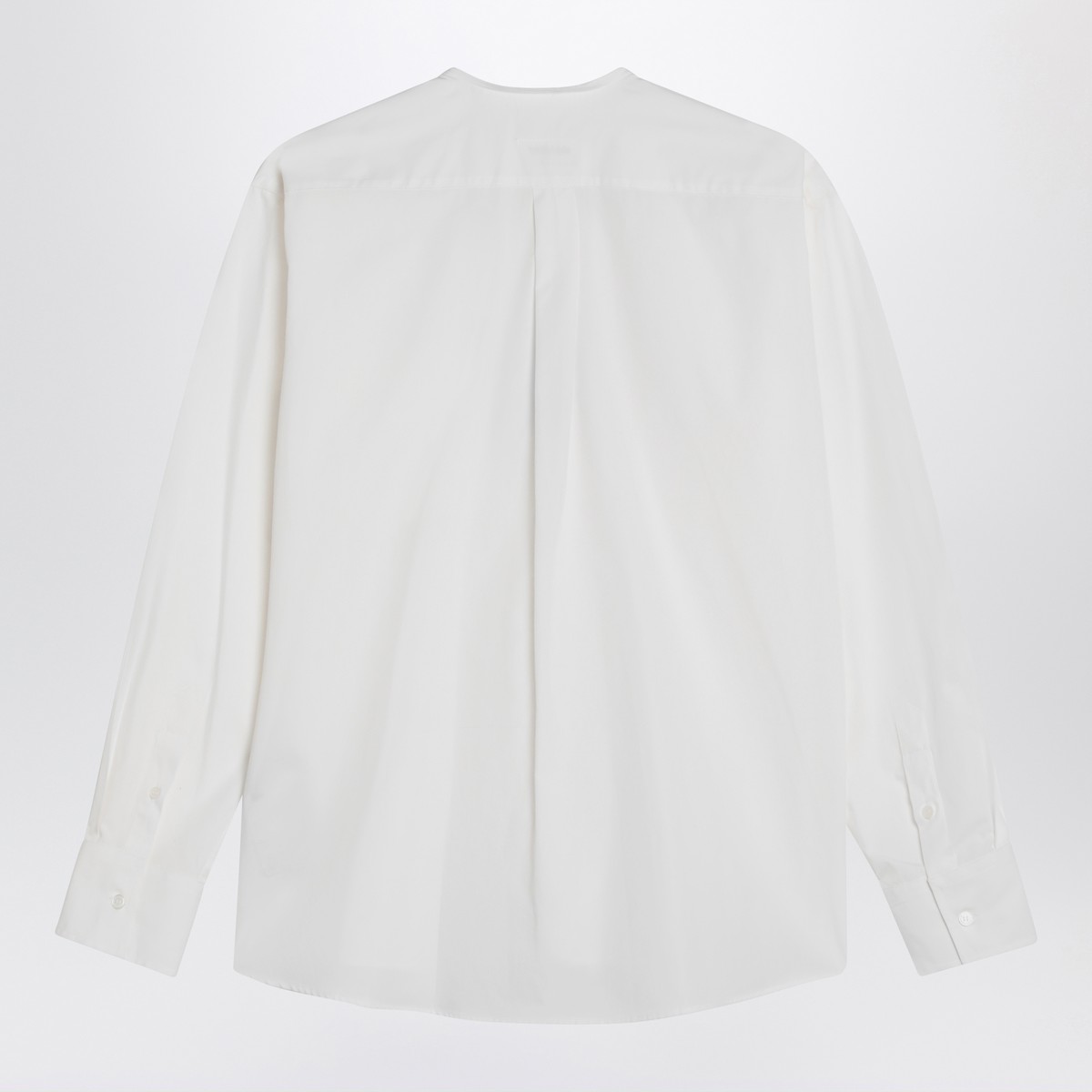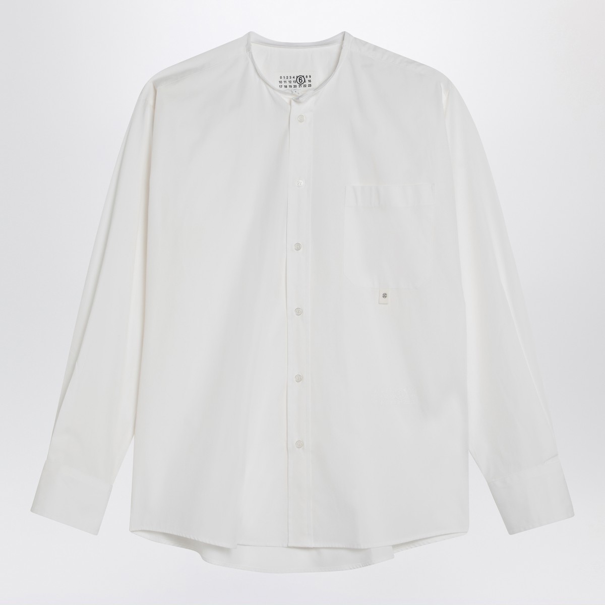 White cotton shirt by MM6 Maison Margiela, featuring an applied chest pocket, long sleeves with buttoned cuffs, a removable zip collar, a curved hem, and a tone-on-tone numeric MM6 signature on the front.