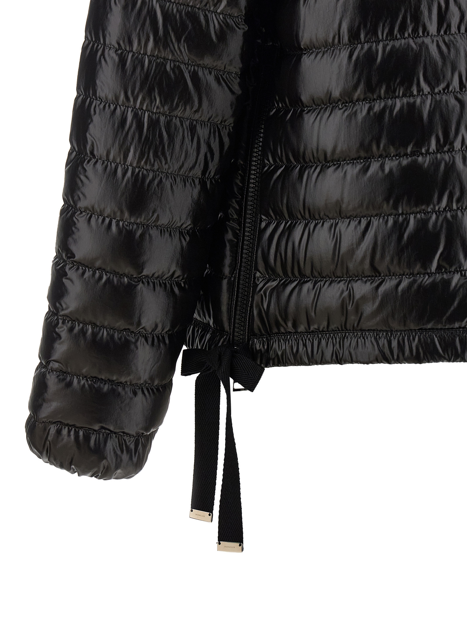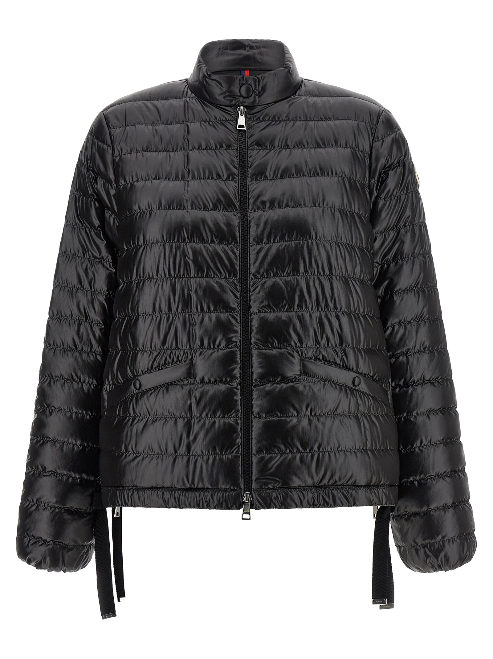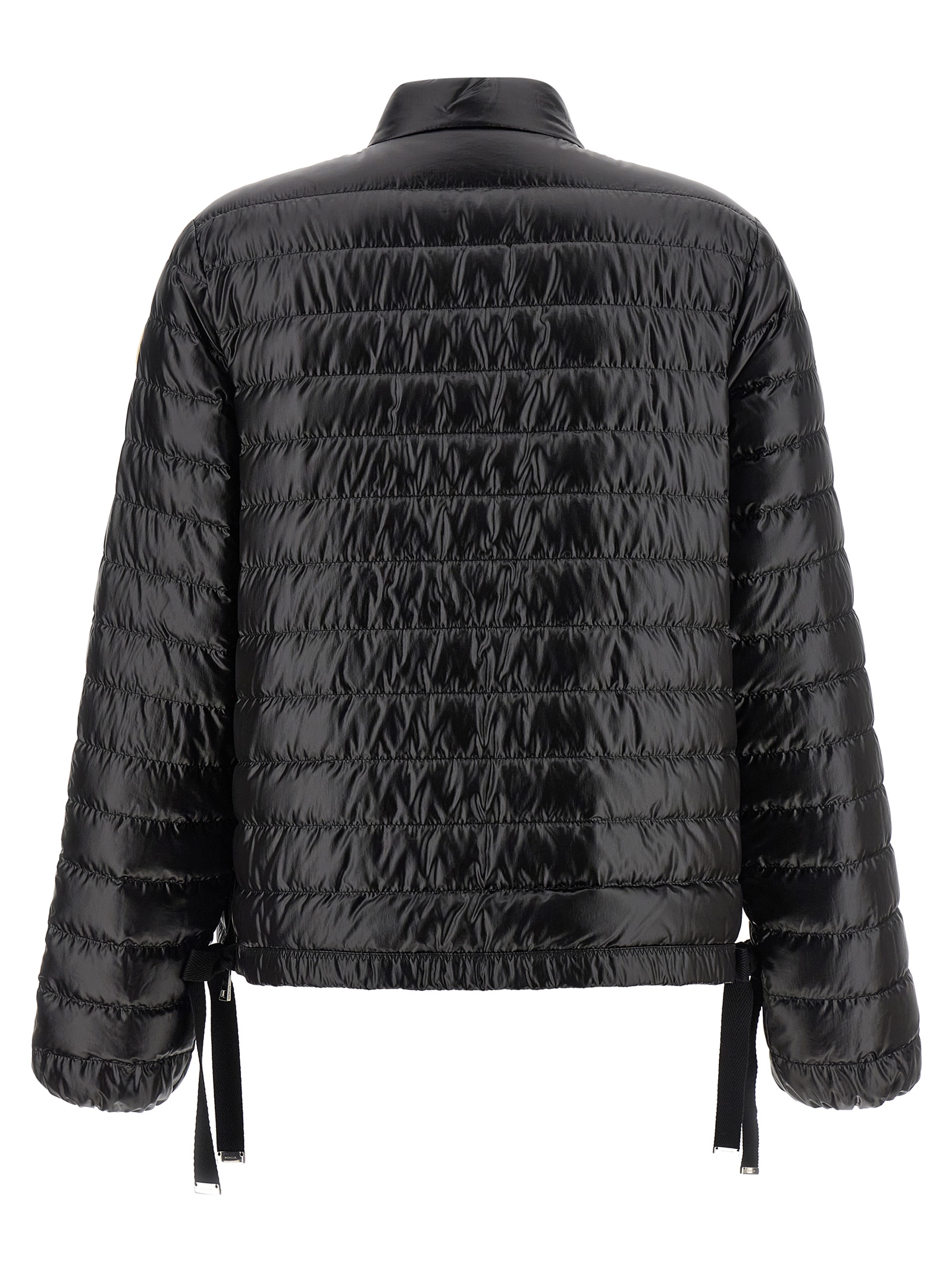 ‘Azalee’ short quilted nylon down jacket, goose down padded saison longue lining, standing collar with snap button closure, front zip closure, pockets, long sleeves with elastic cuffs and felt logo patch, side slits with zip, ribbon drawstring on the hem.