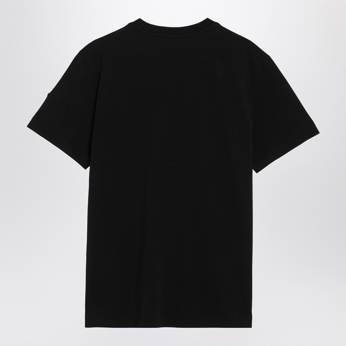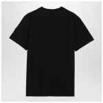 Moncler black cotton T-shirt, featuring short sleeves, ribbed crew neck, and contrasting lettering logo print on the chest.