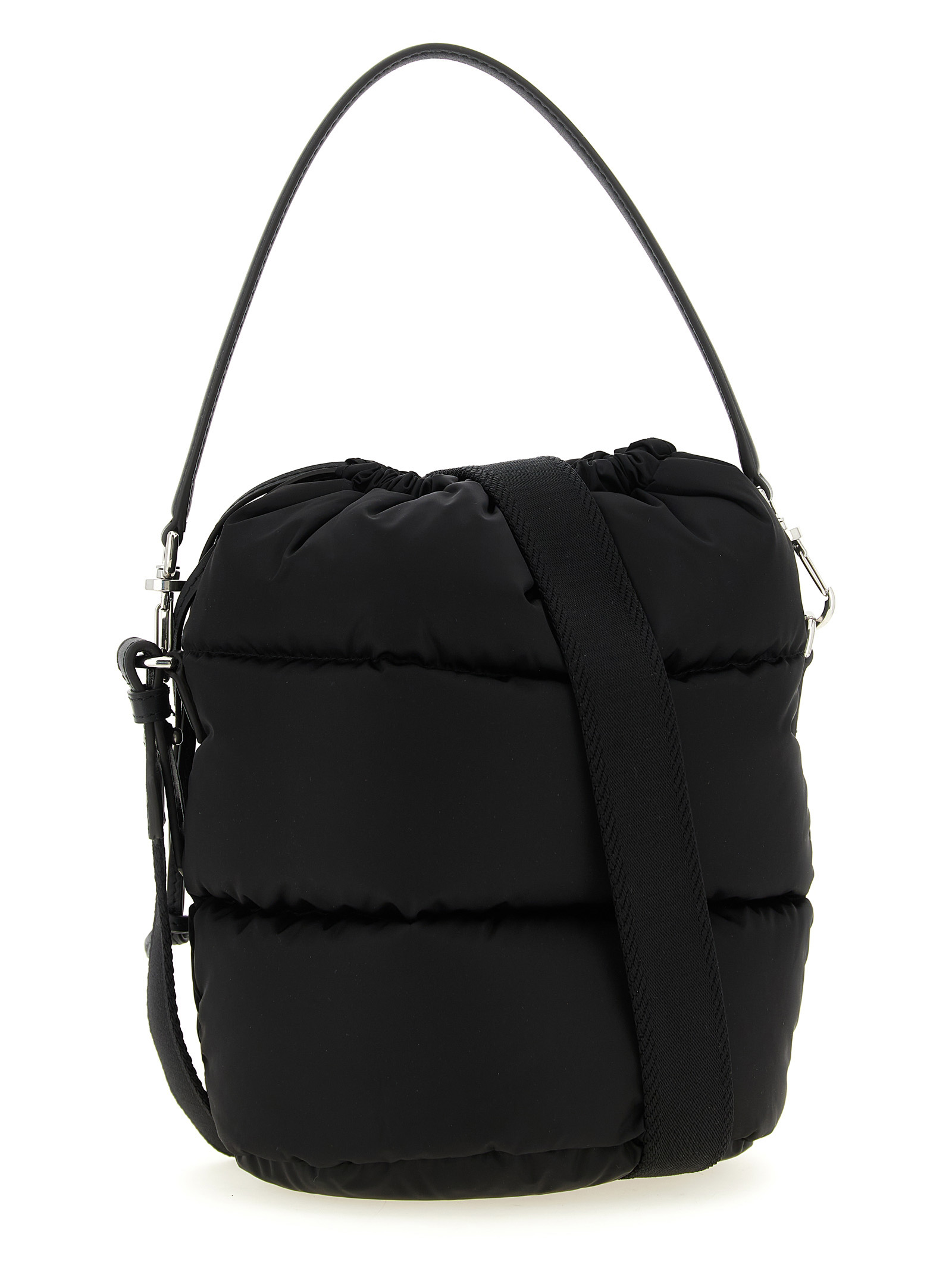 Caradoc’ bucket bag in water-repellent padded boudin quilted nylon with front silver metal logo patch, Removable leather handle, Drawstring closure, Adjustable and removable fabric shoulder strap.