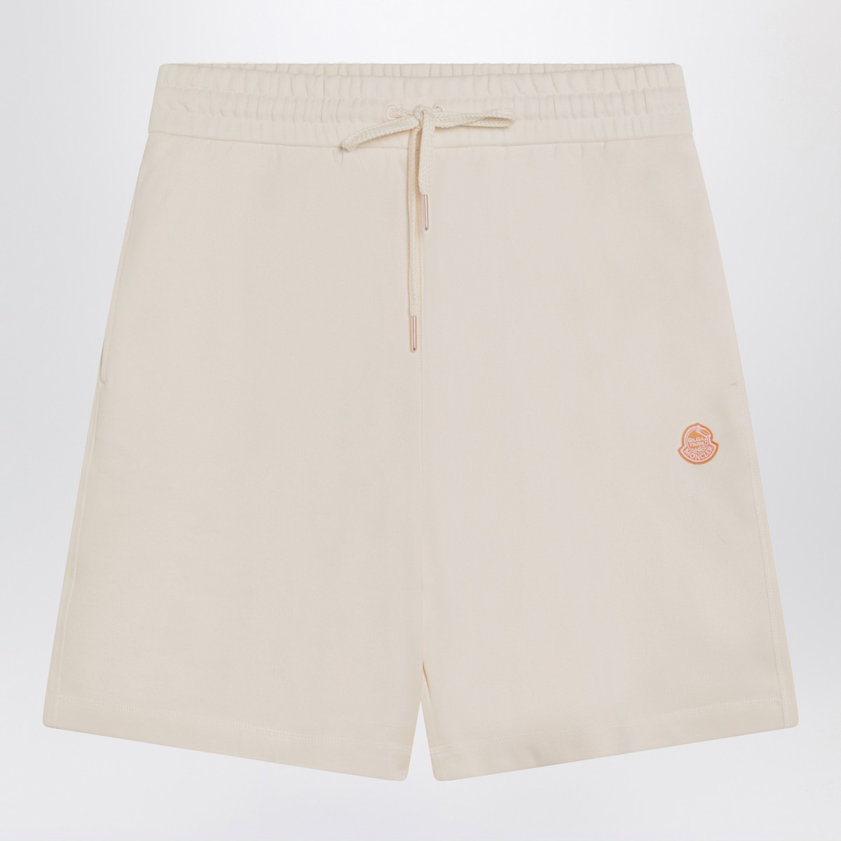 Short by Moncler Genius X Gilga Farm by Donald Glover made of ivory white cotton jersey, characterized by an elasticized waistband with drawstring, two side welt pockets, one applied pocket on the back, and logo patch on the front.