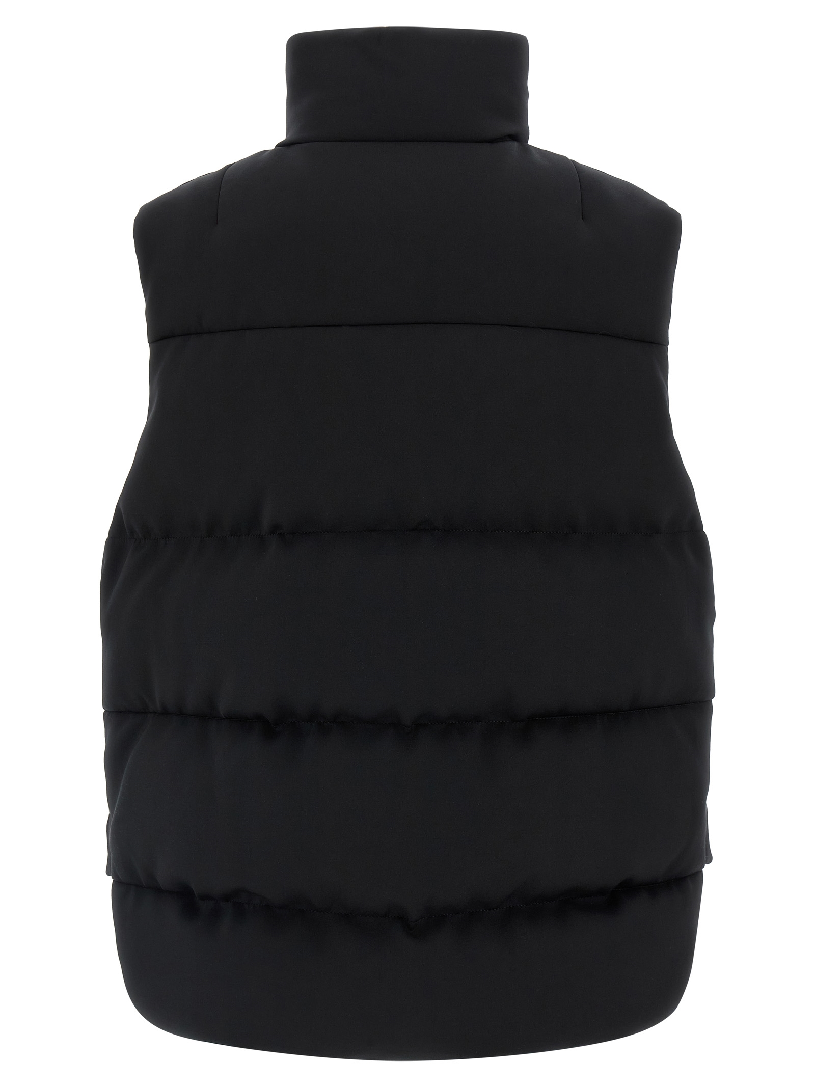 Moncler x edward enninful ‘otis’ vest in quilted hand-peach cotton blend, Nylon lining with goose down padding, High neck, Tone-on-tone logo patch and front zip closure, Pockets, Drawstring at asymmetrical hem, Side slits with snap buttons.