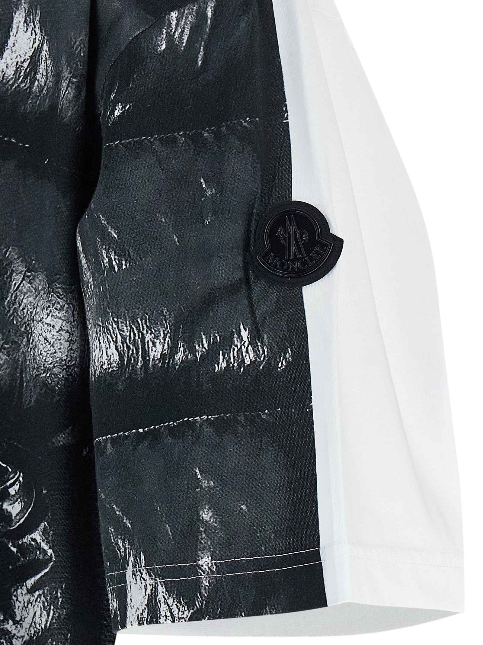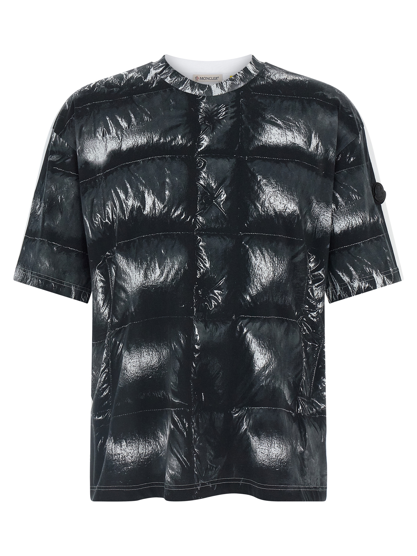 Moncler x A$AP Rocky cotton, crewneck t-shirt with all-over print front panel, side logo patch, and short sleeves.