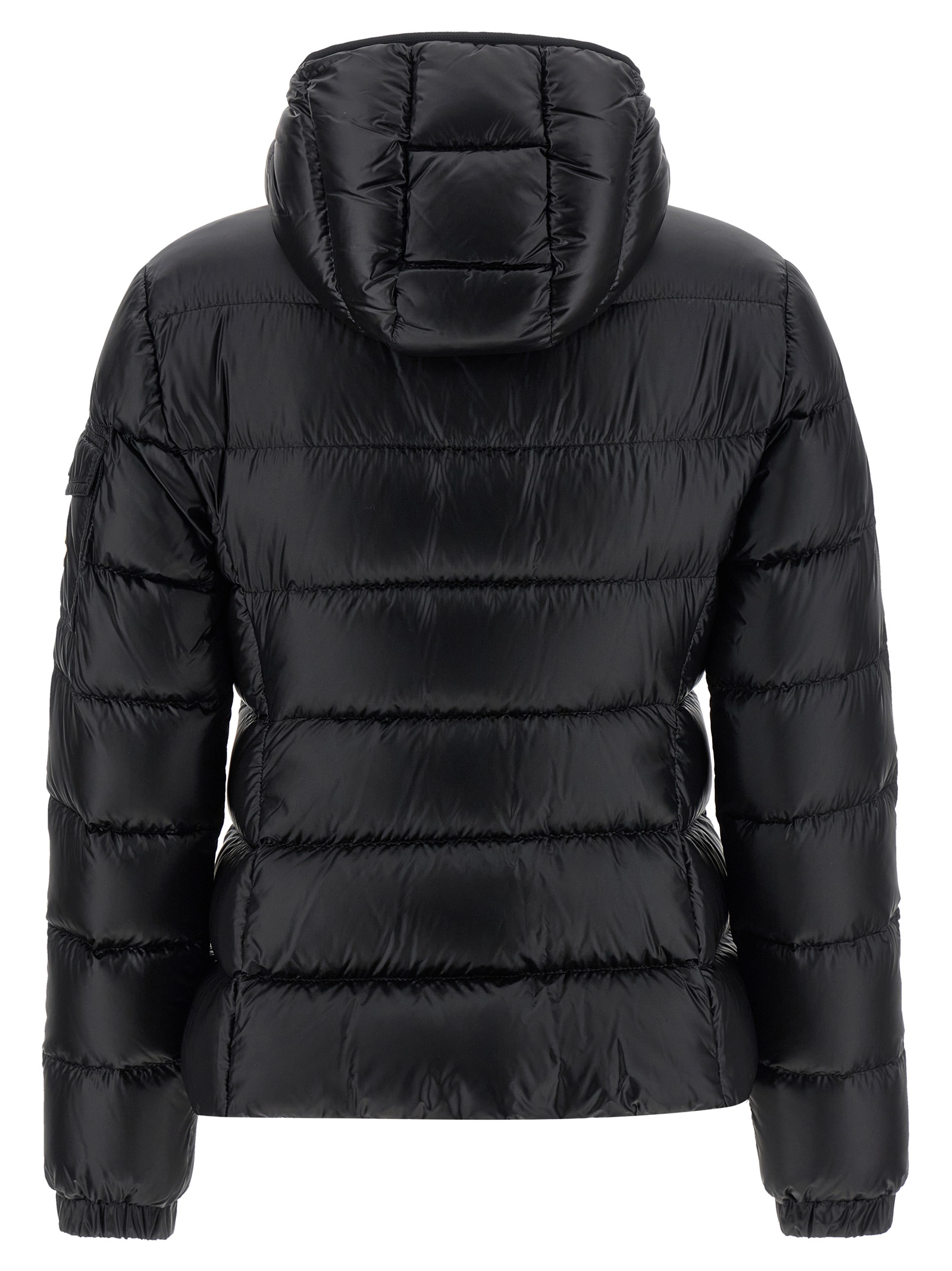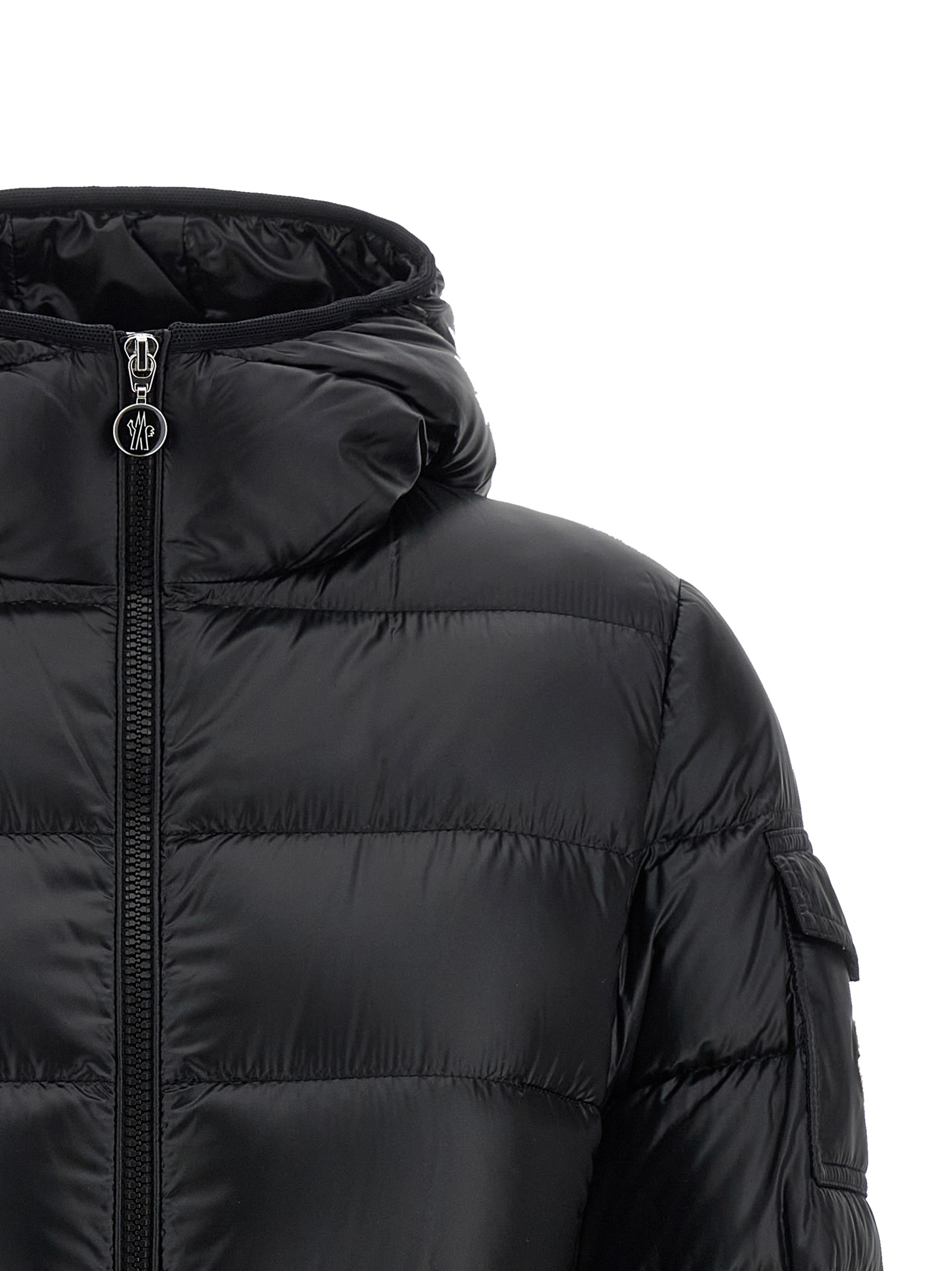 Short ‘glesse’ quilted and goose feather padded saison longue down jacket, Hourglass silhouette, Hood, High neck, Front zip closure, Pockets, Long cuffed sleeves and felt logo patch appliqué.