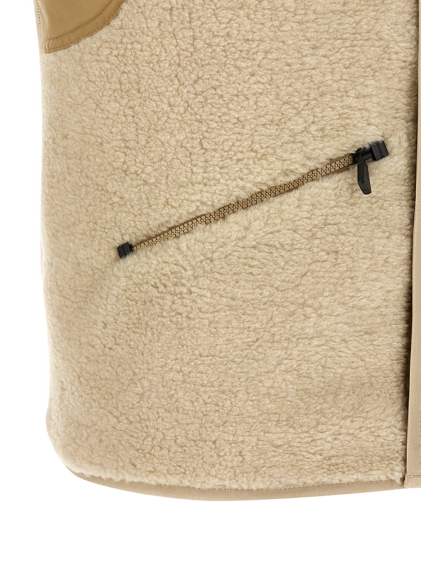Teddy-effect fleece vest with three-layer chambray cotton inserts, Breathable technical mesh lining, Standing collar with contrast corduroy lining, Logo patch and front snap button closure, Pockets.