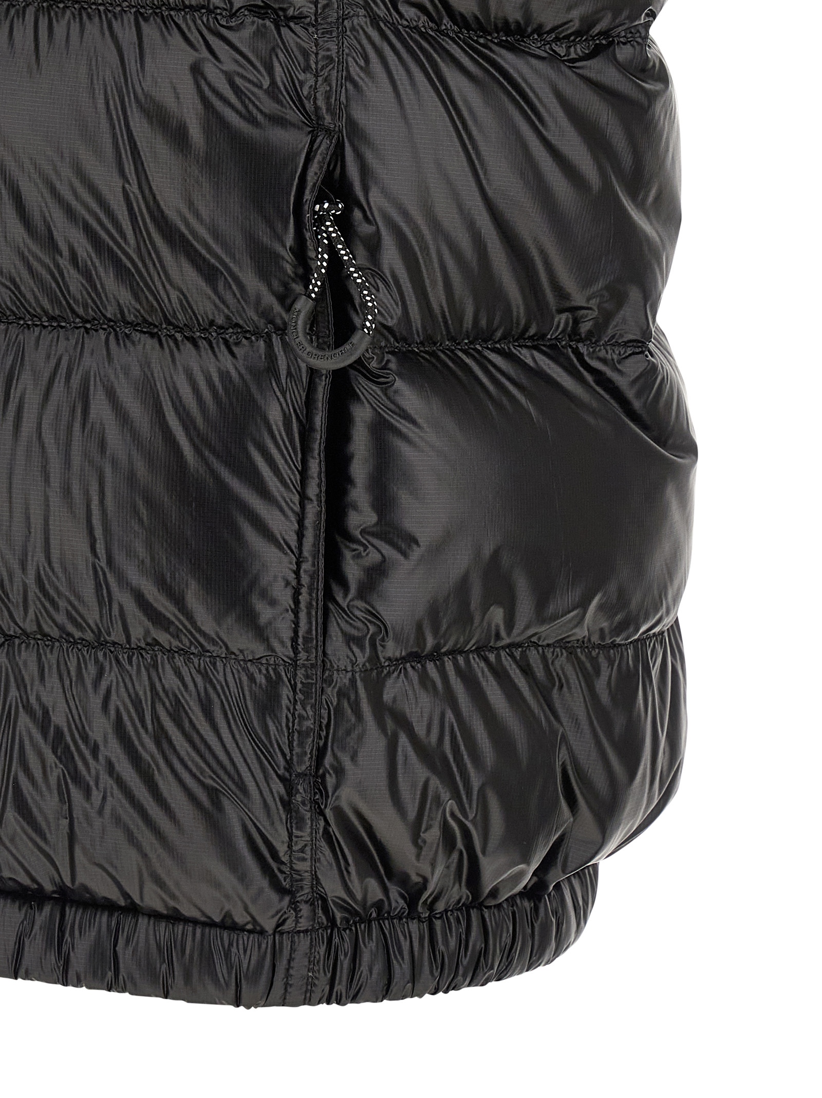 ‘uychi’ quilted water-repellent micro ripstop vest, Goose feather padded polyester lining, Pocket with logo patch, Standing collar, Water repellent look zip closure on the front, Pockets, Foldable.
