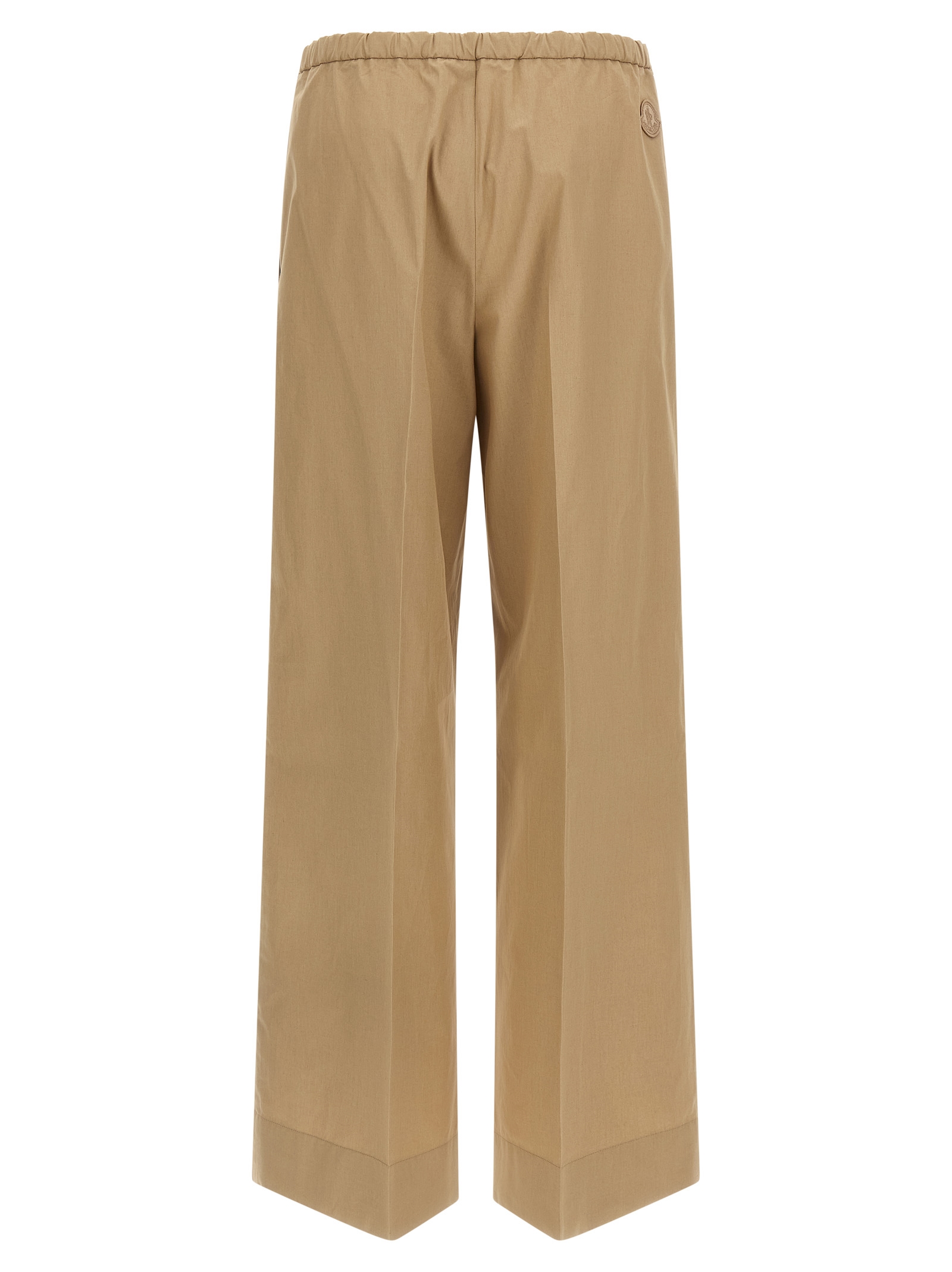Cool cotton poplin trousers, Unlined, Wide and straight leg, Stretched pleat, Elastic waistband, Side zip closure, Pockets, Tone-on-tone grosgrain logo patch.