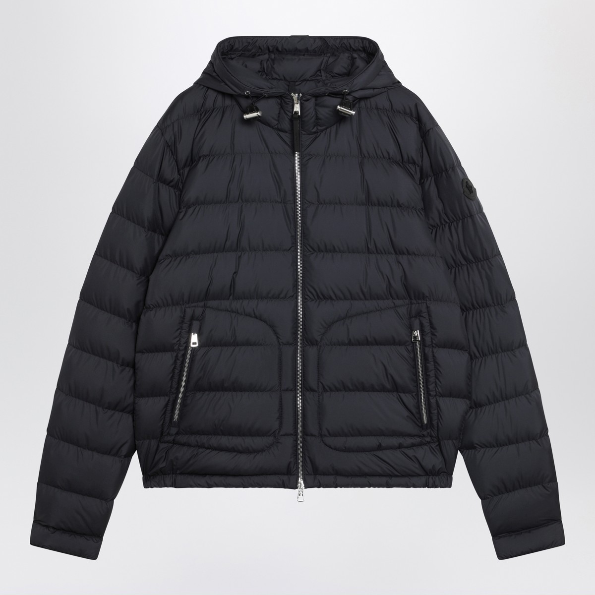 Down jacket by Moncler in navy blue water-repellent longue saison fabric, featuring a hood with drawstring, double zip closure, two front zip pockets, long sleeves with one logo patch and adjustable cuffs.