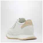Moncler sneakers in white canvas and leather with contrasting beige details, featuring a lateral logo detail, lace-up closure, round toe, tongue with logo patch, mesh lining and rubber sole.