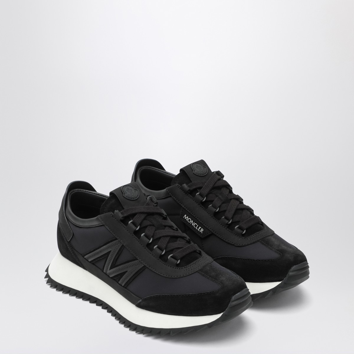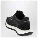 Moncler black sneakers in nylon, suede, and nubuck, featuring a side logo detail, lace-up closure, round toe, logo-patch tongue, mesh lining, and rubber sole.
