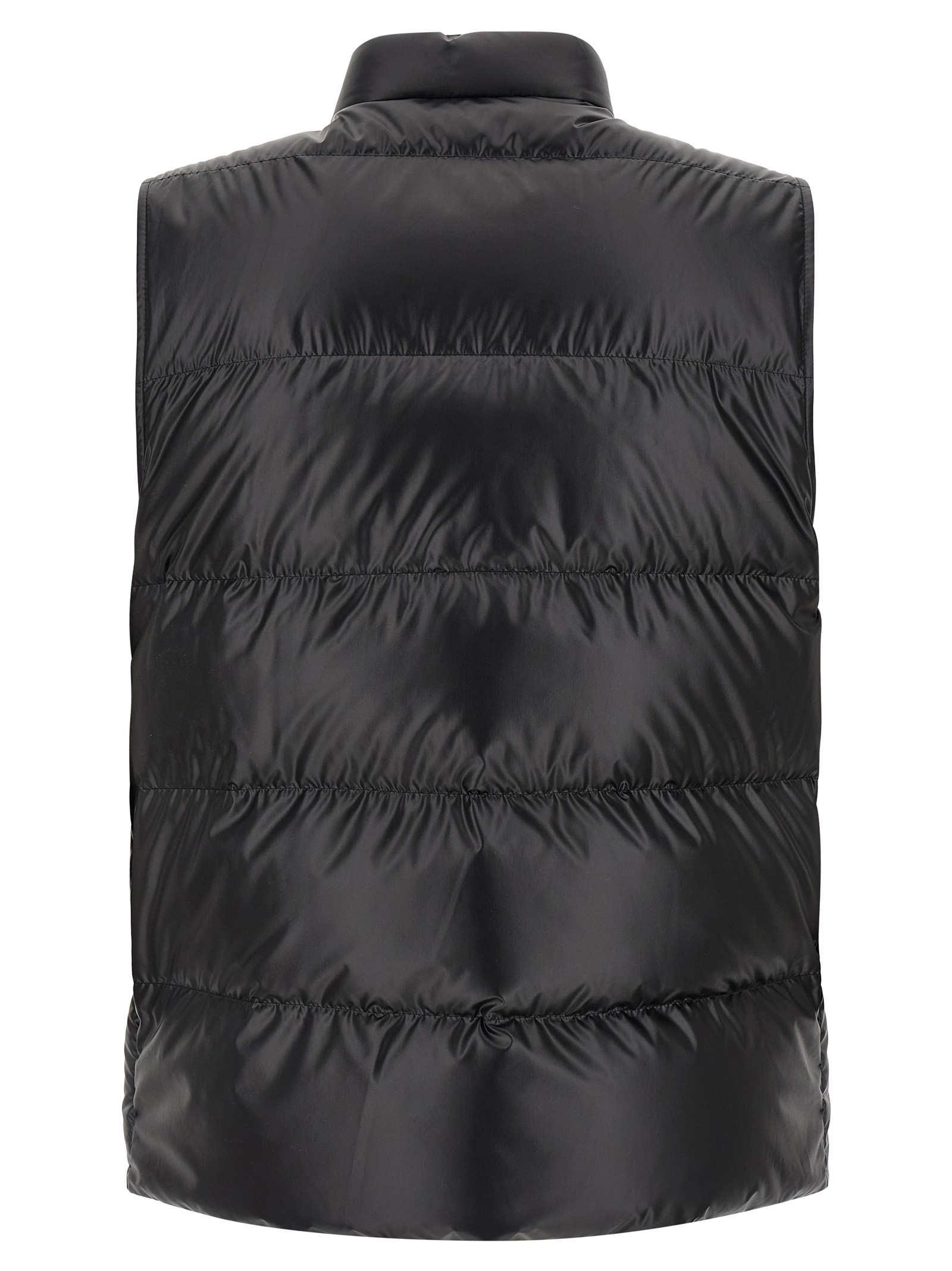 ‘restigo’ vest in quilted technical fabric with goose feather padding, Standing collar, Felt logo patch, Front zip and snap button closure, Pockets.