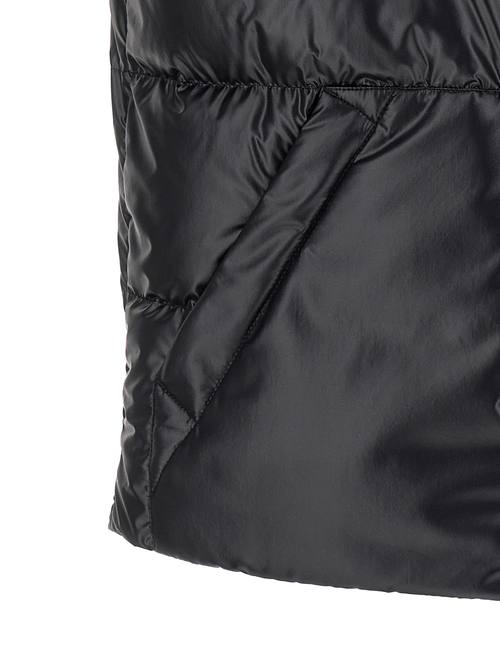 ‘restigo’ vest in quilted technical fabric with goose feather padding, Standing collar, Felt logo patch, Front zip and snap button closure, Pockets.
