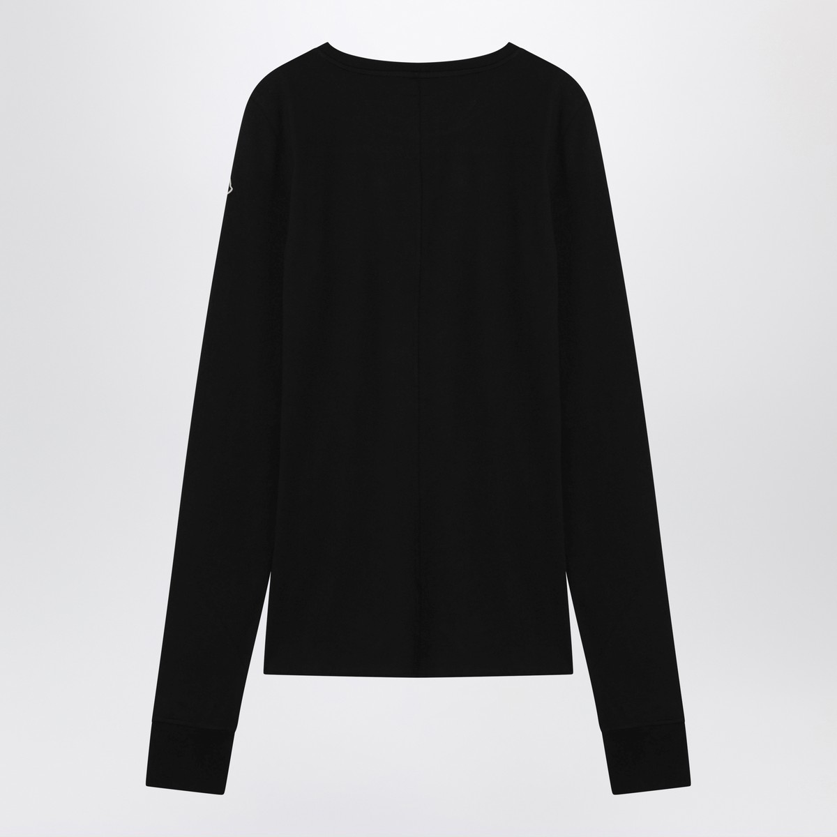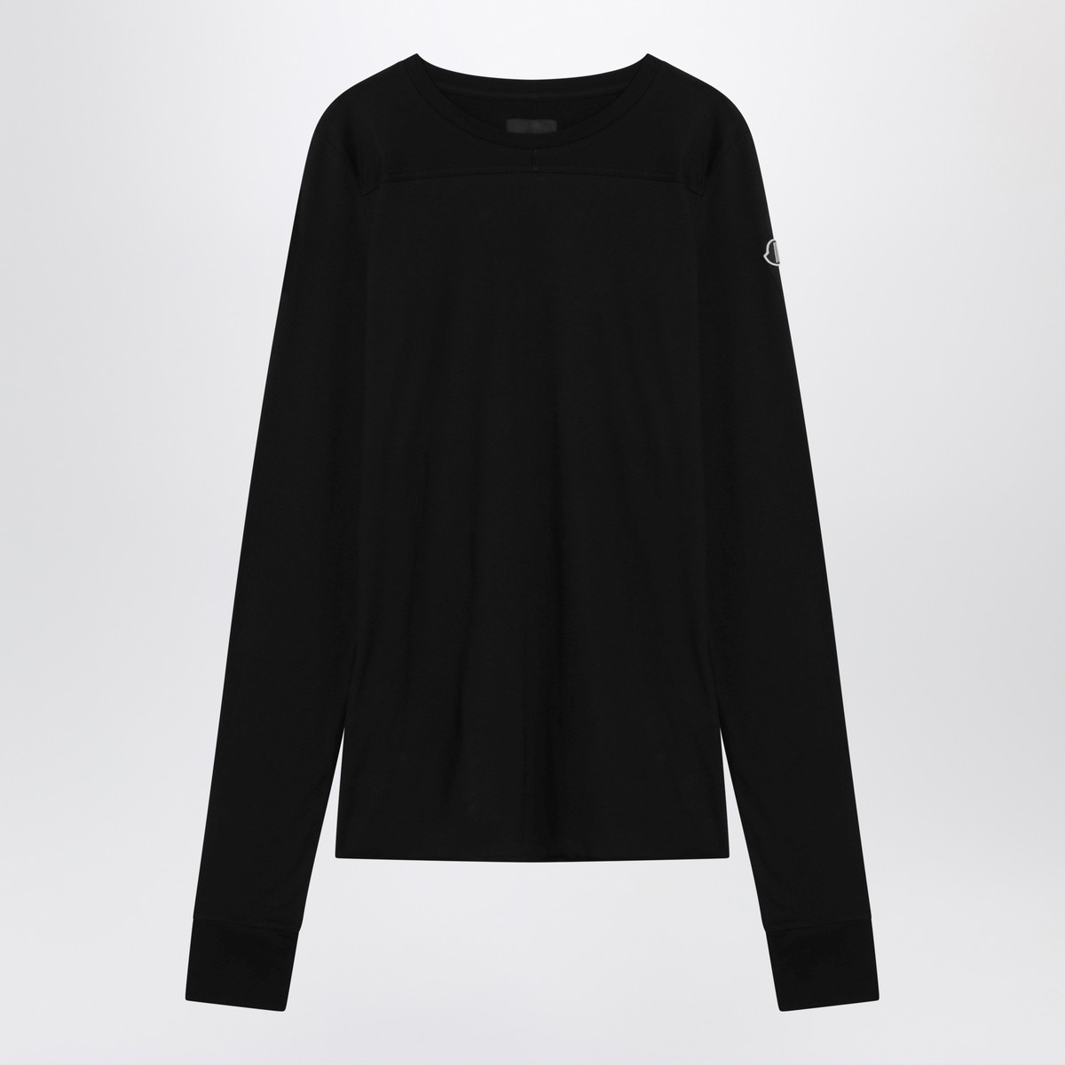 Rick Owens sweater created in collaboration with Moncler in black cotton, featuring a ribbed crew neck and long sleeves with one sleeve bearing a logo patch.