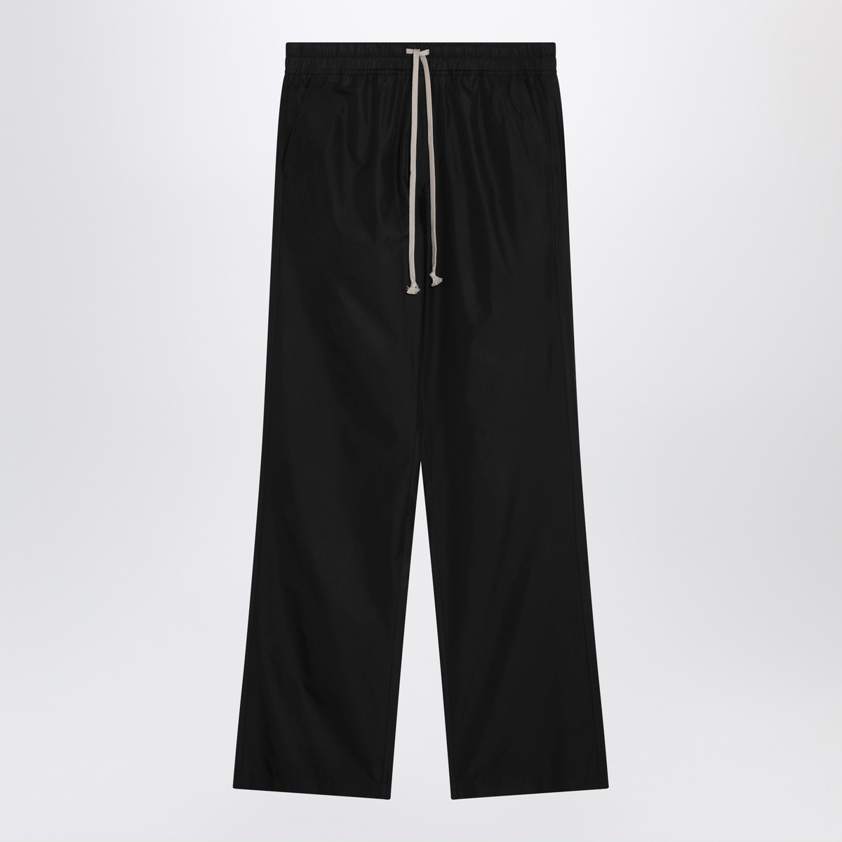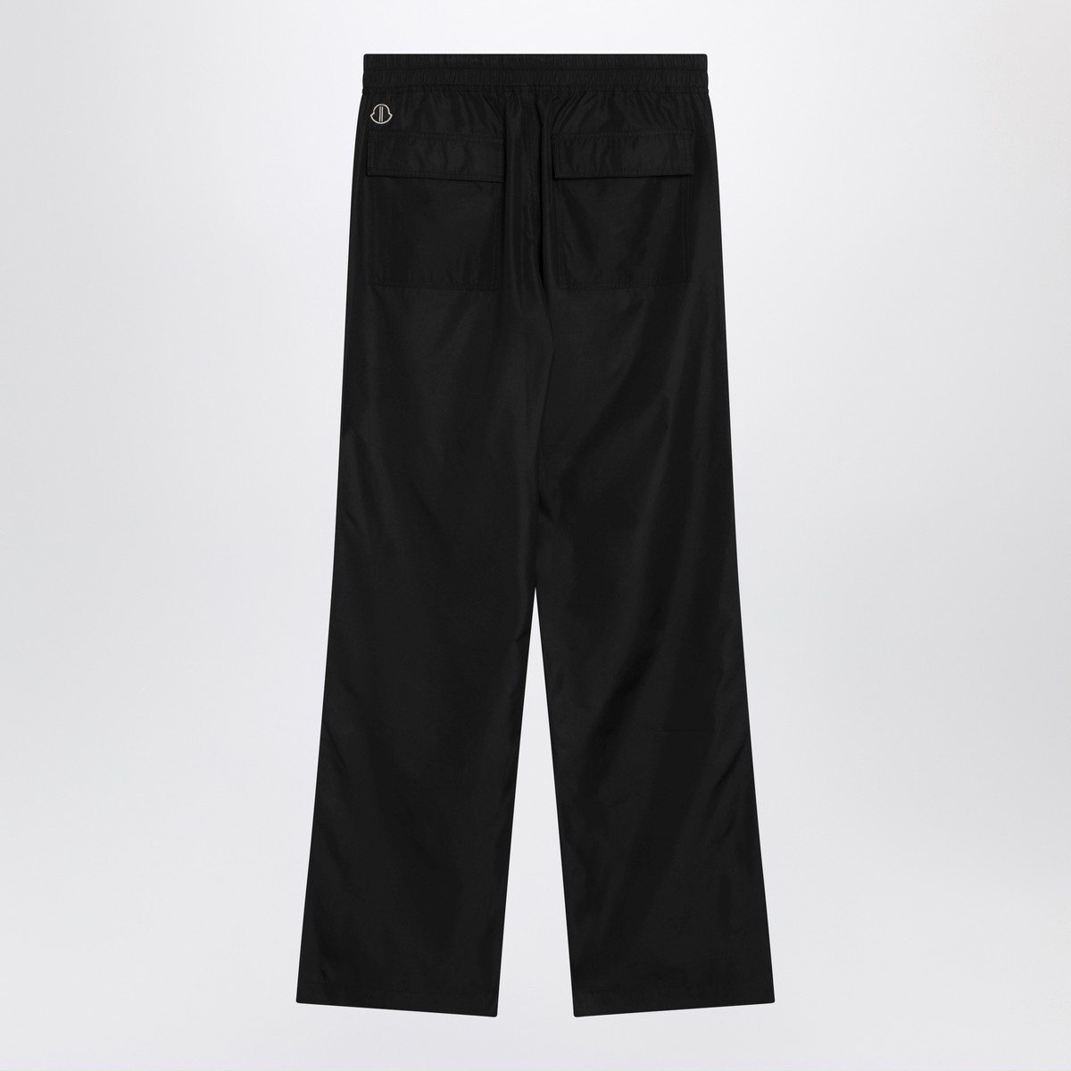 Rick Owens trousers created in collaboration with Moncler in black, featuring an elasticated waistband with drawstring, two side pockets, two rear patch pockets with flaps, and rear logo embroidery.