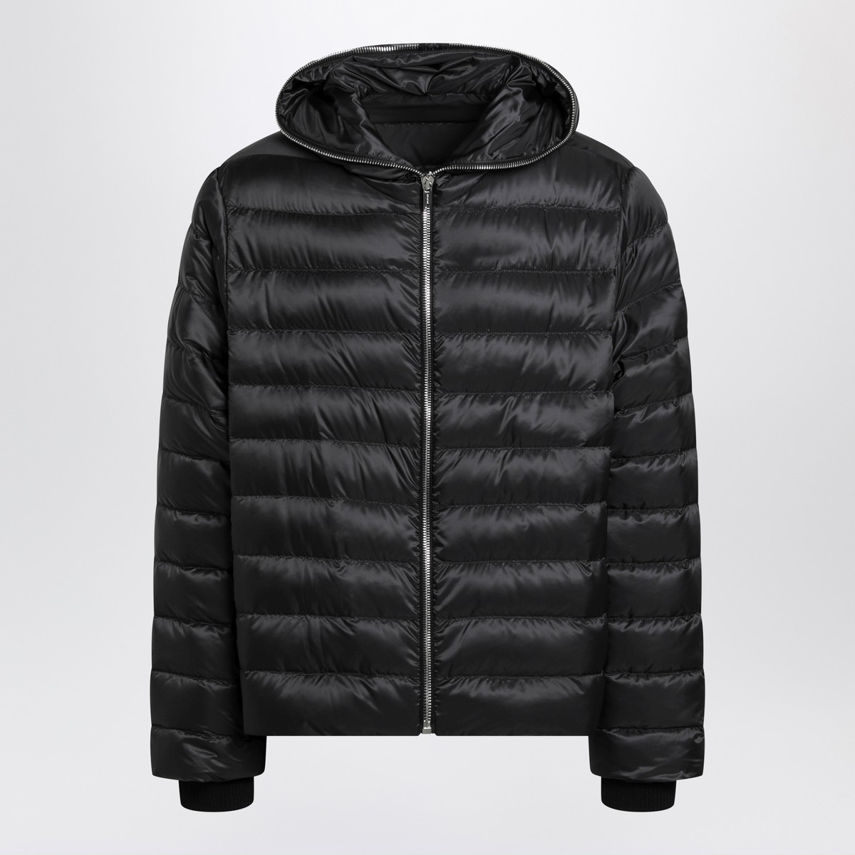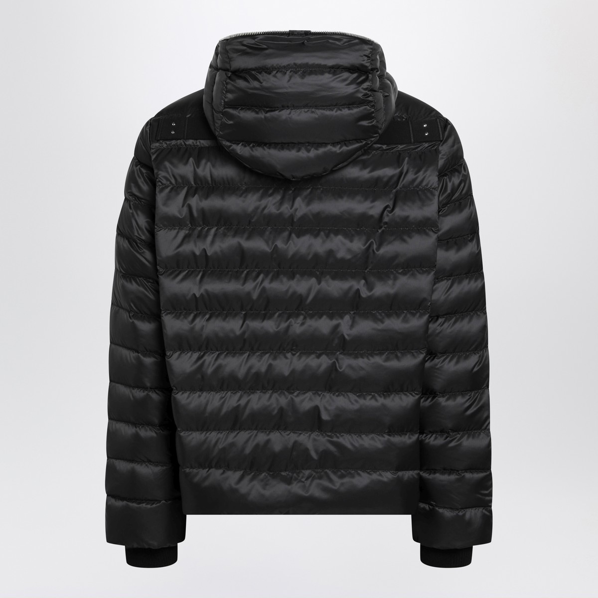 Rick Owens quilted down jacket created in collaboration with Moncler in black, featuring a visible front zip closure extending to the edge of the hood, long sleeves with one sleeve bearing a logo patch, rib-knit cuffs, and a horizontal strap at the back.