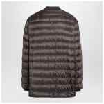 Rick Owens quilted down jacket created in collaboration with Moncler in mud color, featuring a visible front zip closure, long sleeves with one sleeve bearing a logo patch, rib-knit collar and cuffs, and two side pockets with snap buttons.