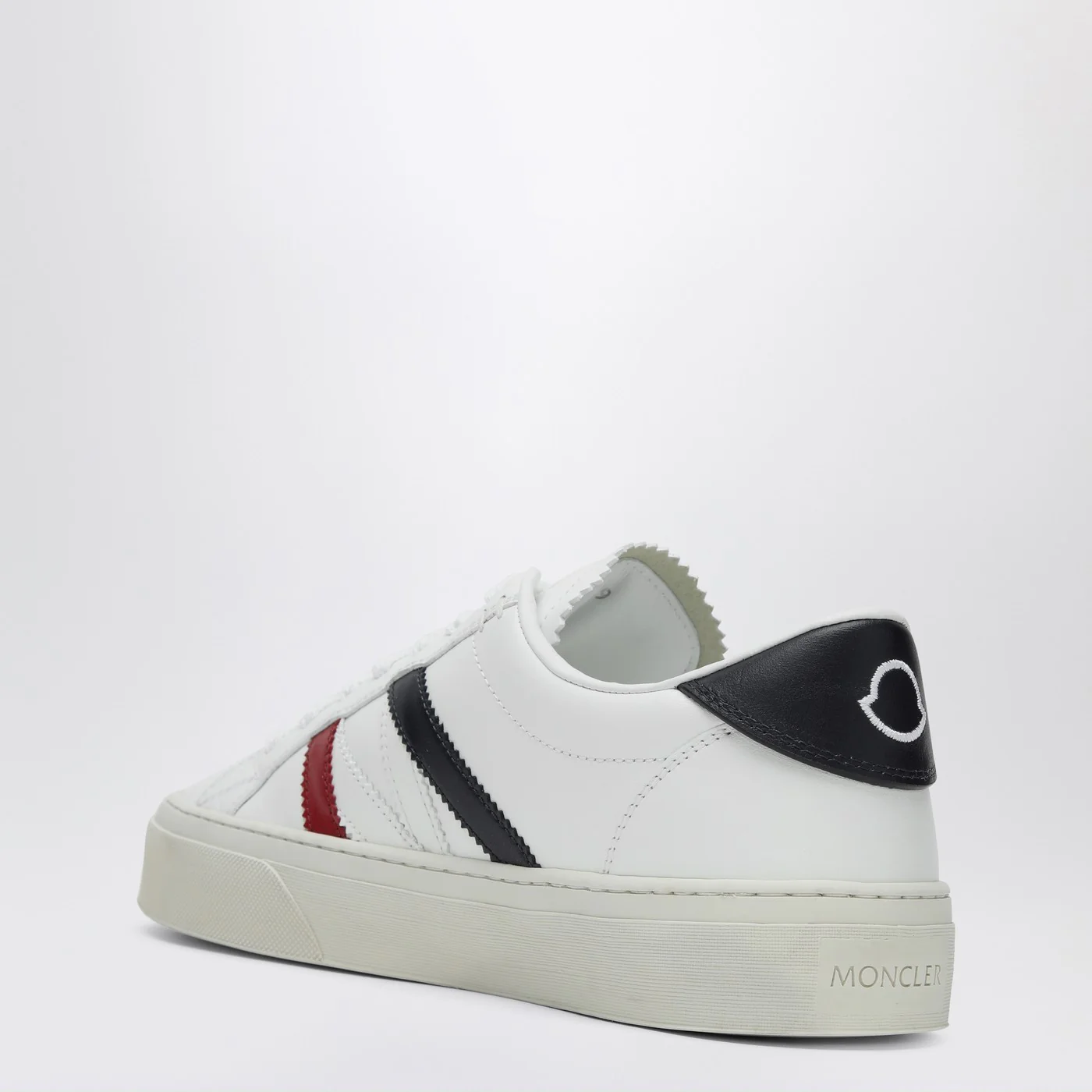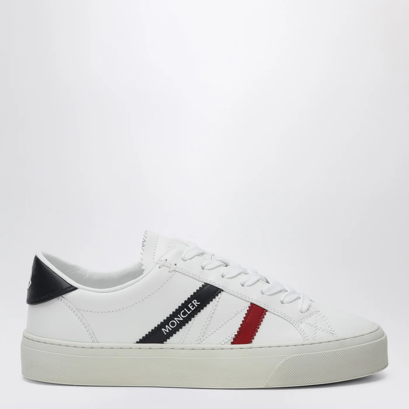 White leather low top sneaker from Moncler featuring blue and red contrasting side details lace-up fastening round toe logoed tongue blue branded heel and white rubber sole.