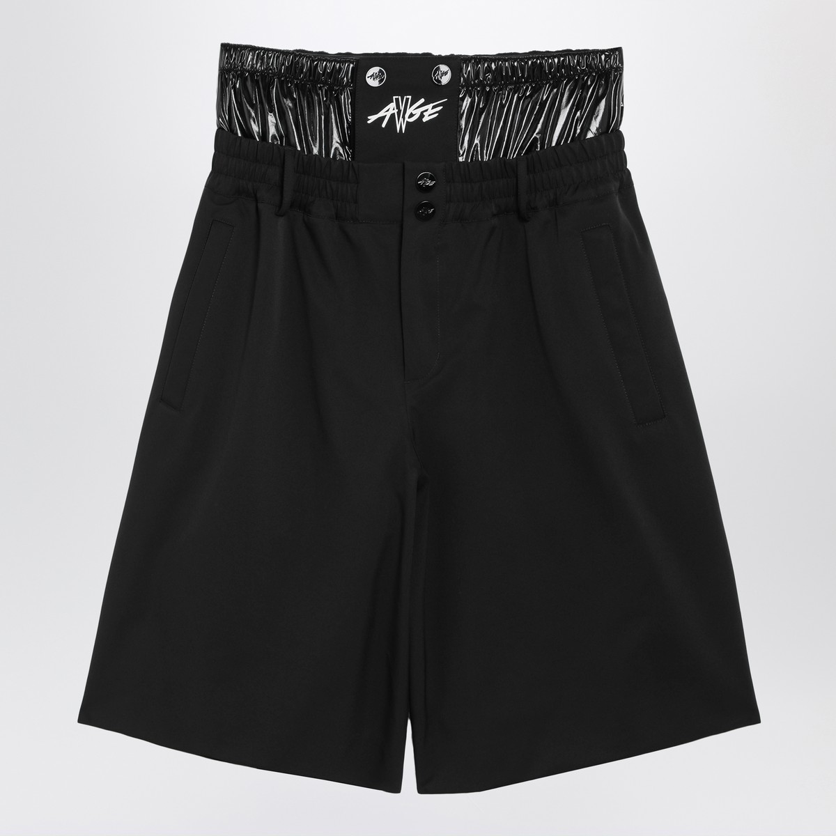 Bermuda shorts by Moncler Genius X A$AP Rocky in stretch nylon blend with breathable structure in black, featuring double-layer insert at the waist in nylon laqué, snap-button and zip closure, zip pockets with snap-button flaps, printed logo, tone-on-tone logo patch, and oversized silhouette.