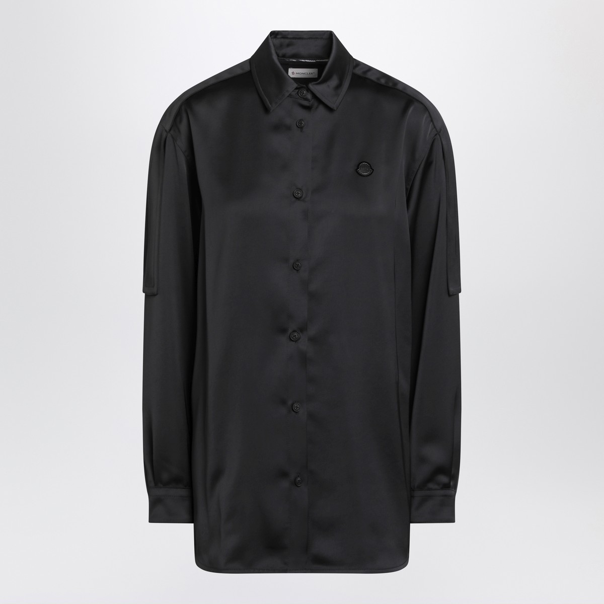 Shirt by Moncler Genius X EE72 by Edward Enninful in black, featuring classic collar, front button closure, long sleeves with buttoned cuffs, logo patch on the chest, and adjustable waist detail with rivets at the back.