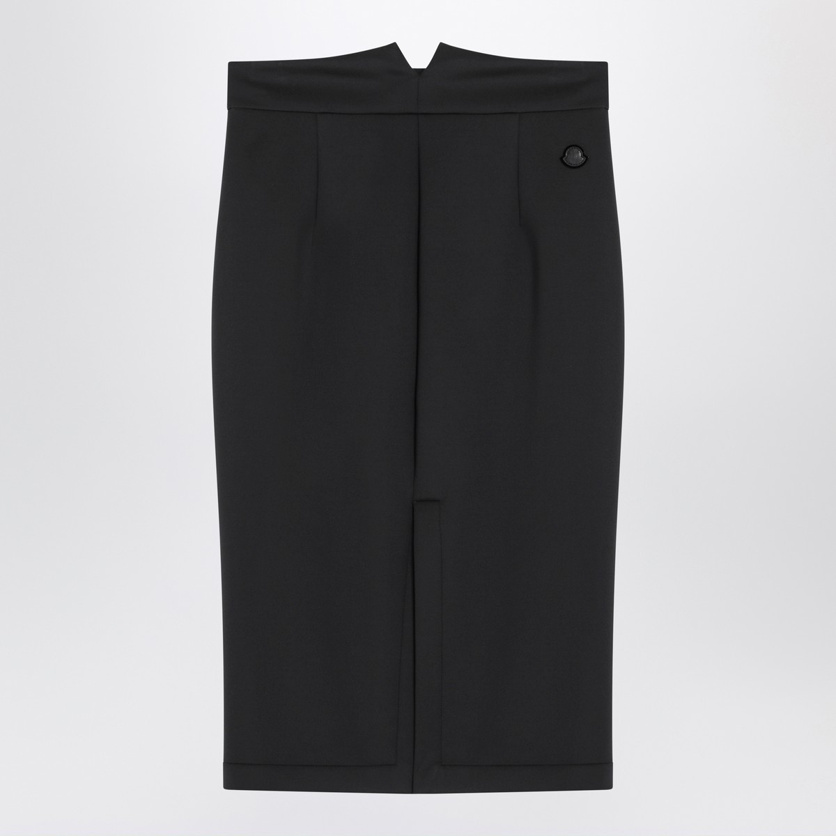 Black pencil skirt by Moncler Genius X EE72 by Edward Enninful, featuring back logo patch, V-cut waist, and back slit.