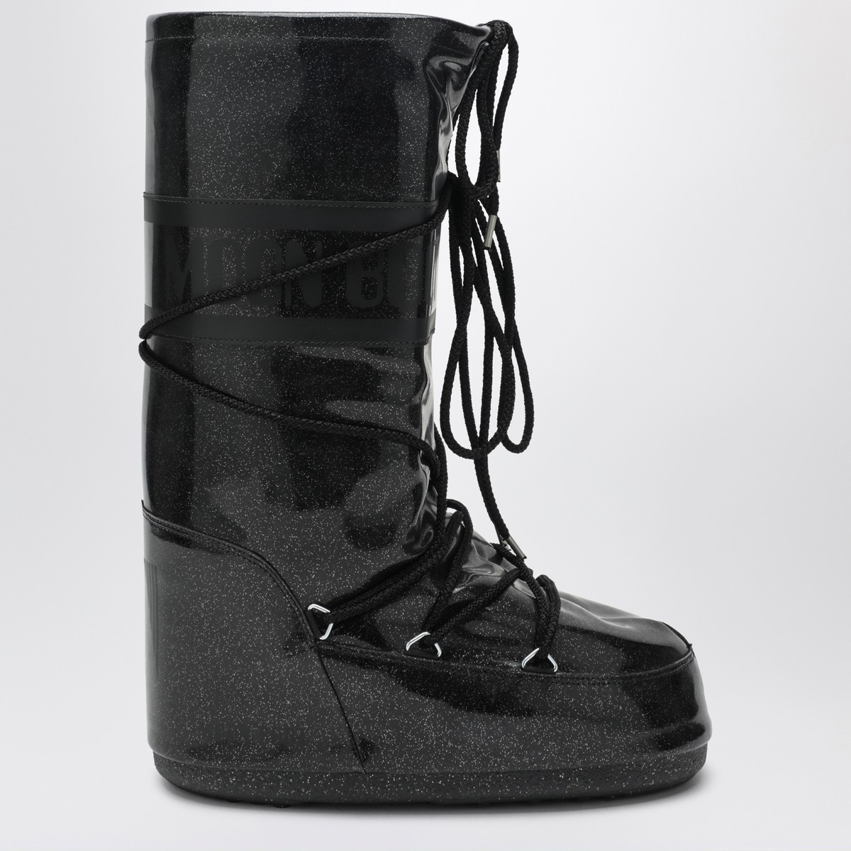 Black glitter Moon Boot, featuring water-repellent padded interior, genderless ambidextrous design, logo strap, logo heel and trim, silver-tone metal eyelets, crisscross tubular laces, adjustable drawstring, thermoplastic rubber midsole, and non-slip thermoplastic rubber outsole.