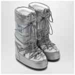 Moon Boot silver satin boots featuring water-repellent padded interior, genderless ambidextrous design, logo strap and heel details, silver-tone metal eyelets, tubular crisscross laces, adjustable drawstring, thermoplastic rubber midsole, and anti-slip sole.