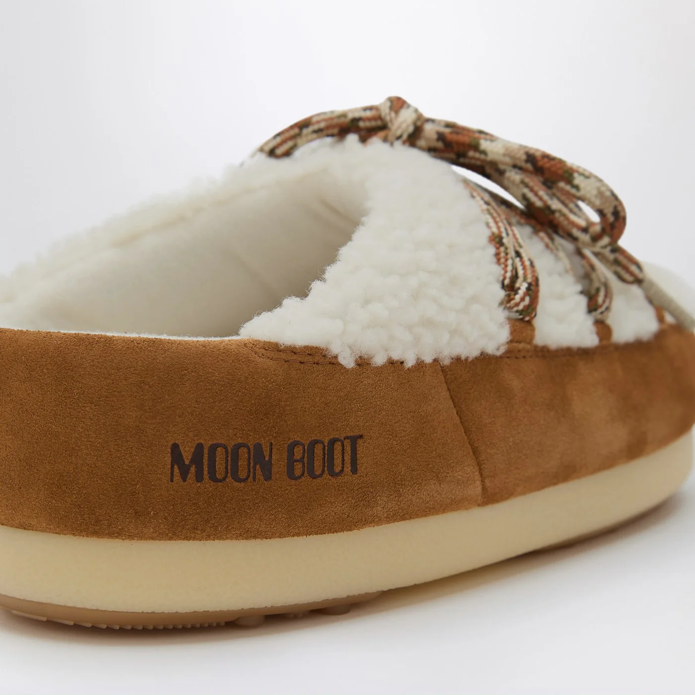 Mules by Moon Boot with a white shearling upper and brown suede trims featuring a slip-on ambidextrous design printed logo on the heel silver-tone metal eyelets crossed tubular laces thermoplastic rubber midsole and non-slip thermoplastic rubber outsole.