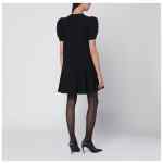Black mini dress by Moschino characterized by a round neck design, zip closure at the back, short puff sleeves, and a short skirt with pleated detail.