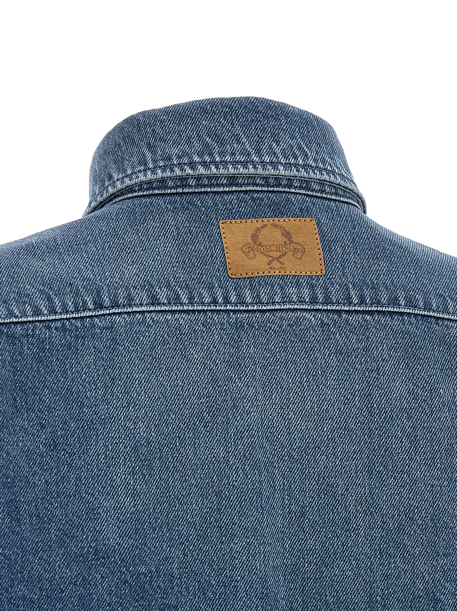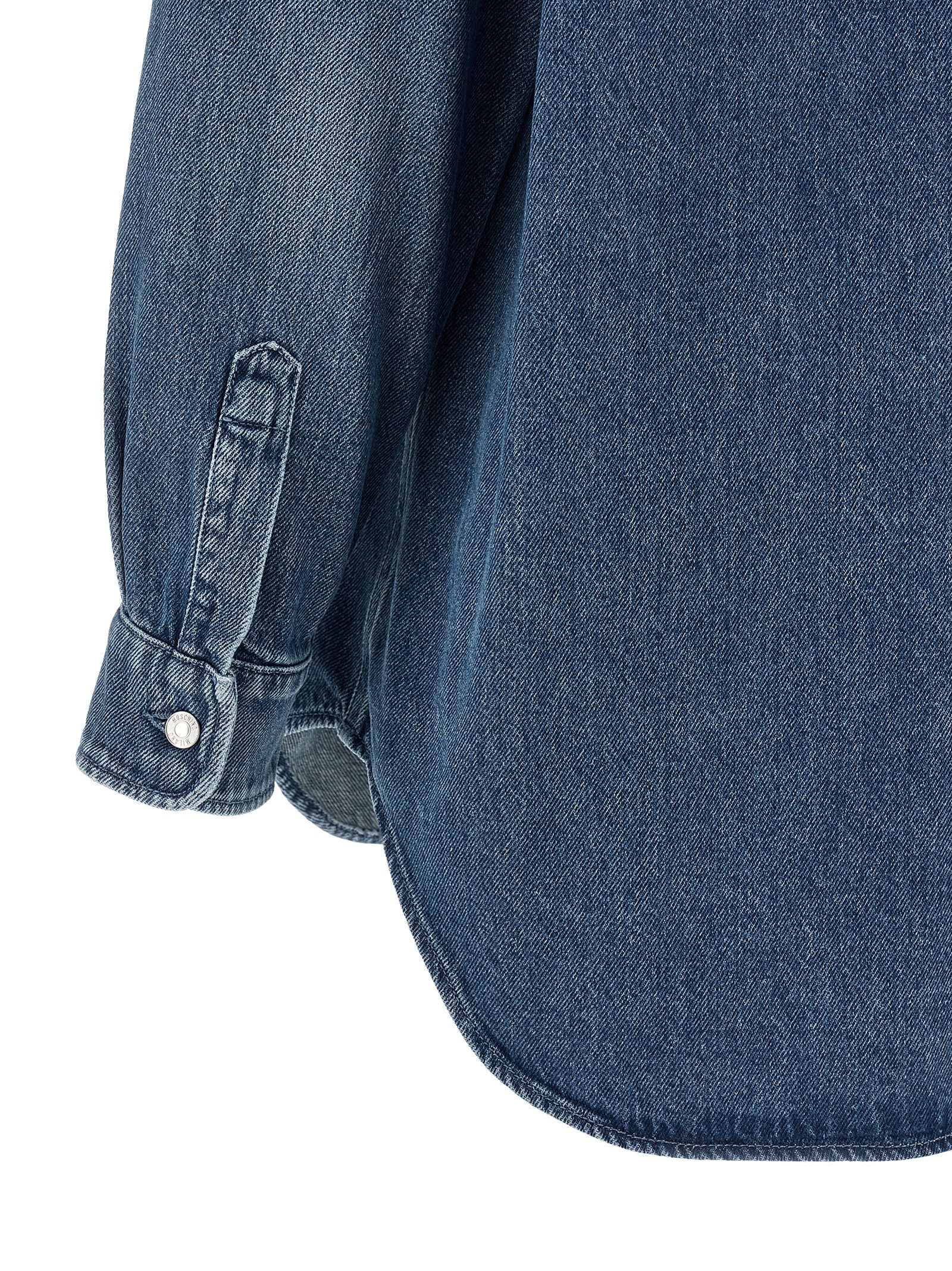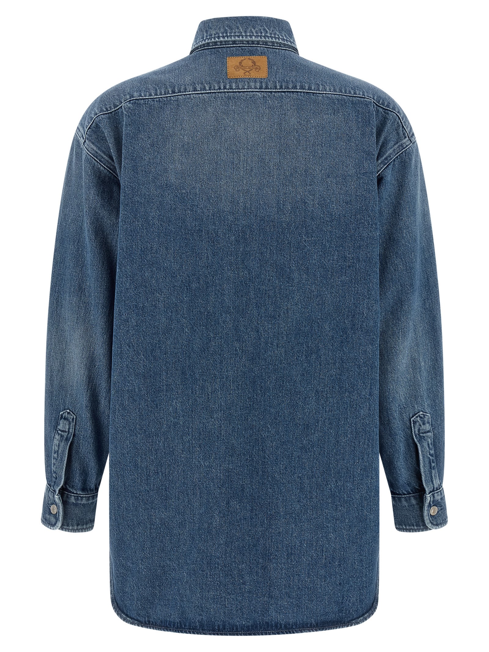 Stone-washed cotton denim shirt, used-effect ‘Heart’ detail with front fringed edges, button closure, long sleeves with cuffs and dropped shoulder, leather logo patch at the back, rounded and asymmetrical hem.