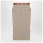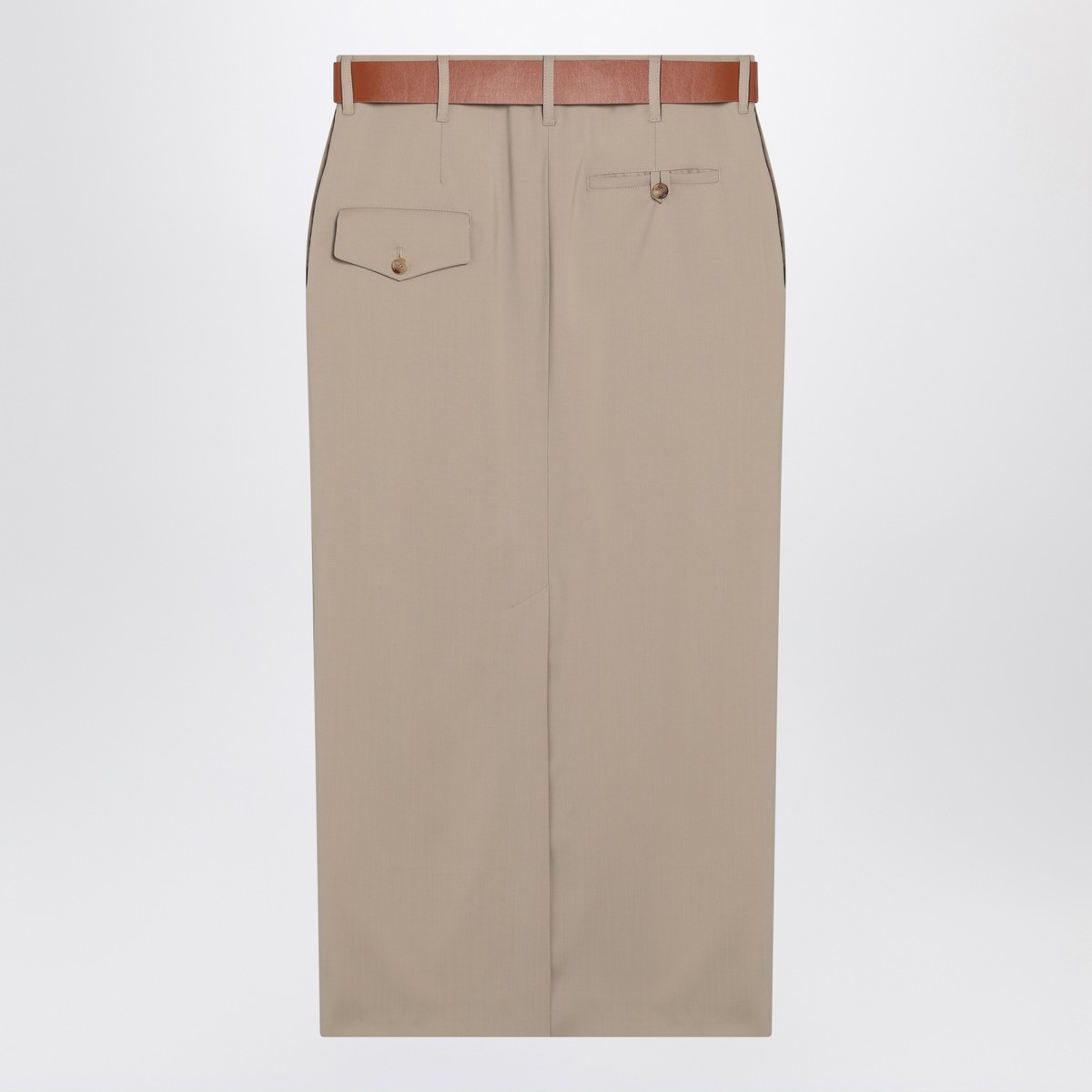 Beige virgin wool midi dress by Moschino, characterized by an adjustable and removable belt, belt loops at the waist, two side welt pockets, side buttons, a back slit, one flap pocket with button, and one welt pocket with button at the back.