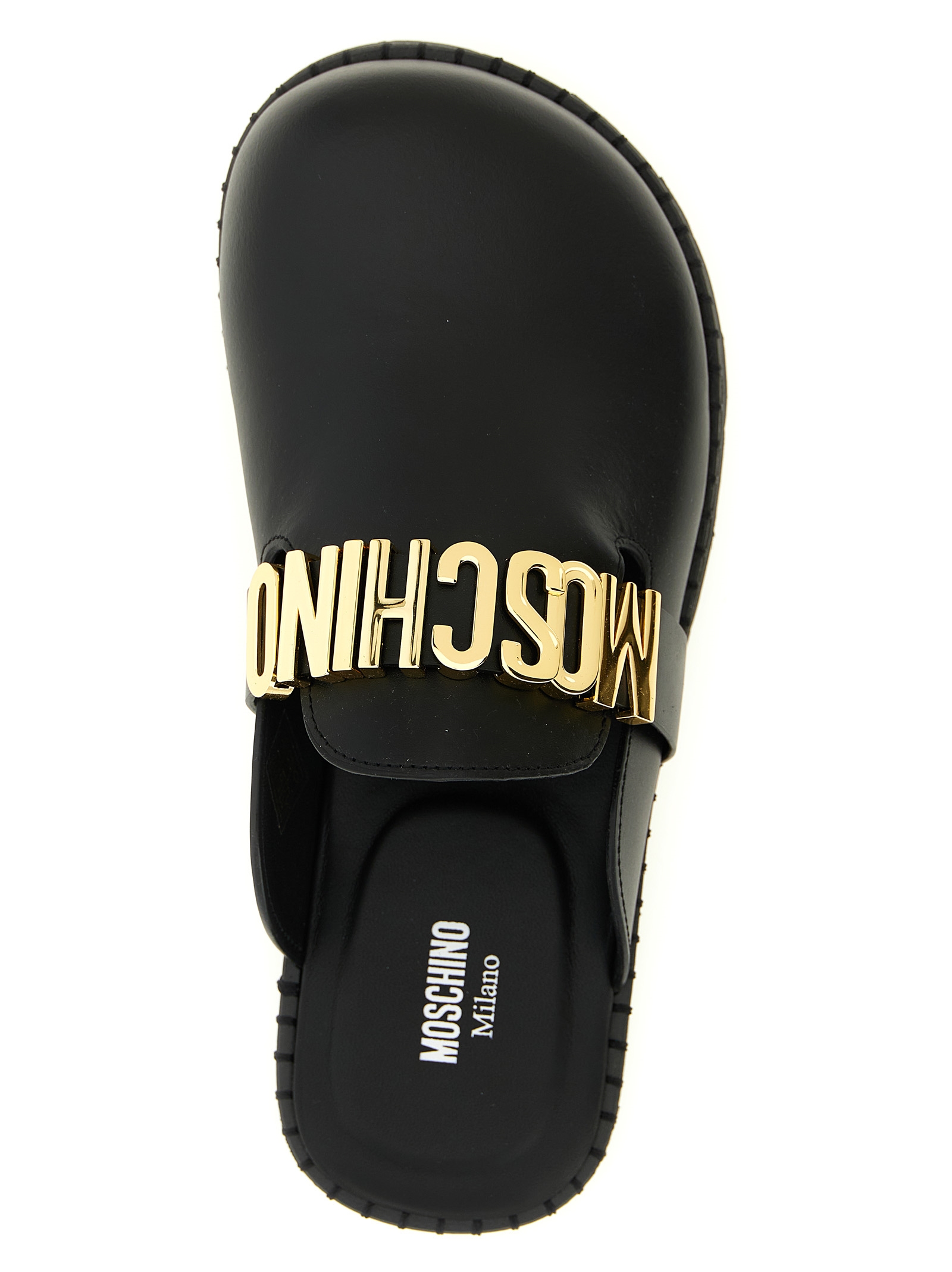 Leather sabots, strap with metal lettering logo, micro midsole, TPU sole with polka dot effect.