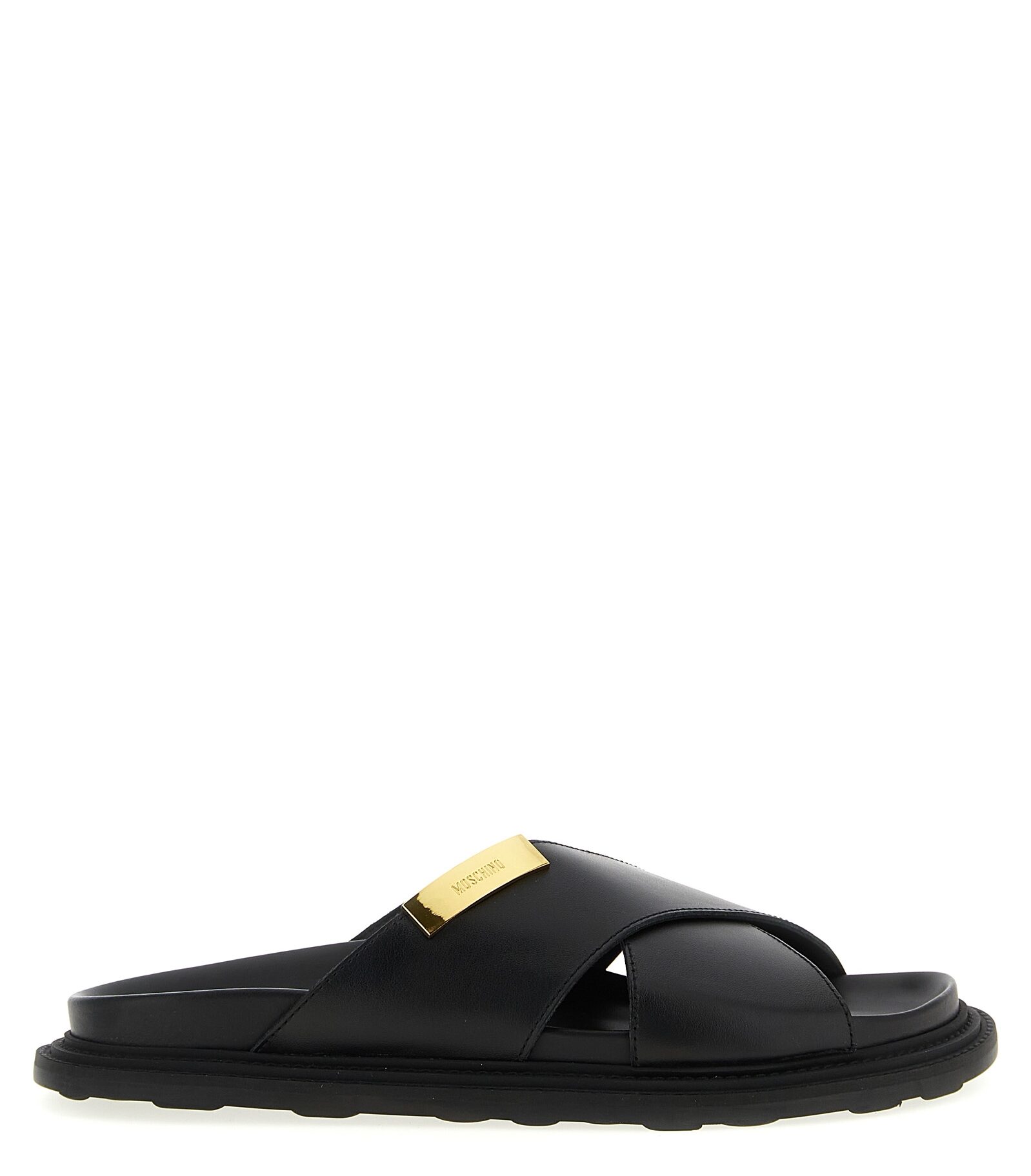 Leather sandal, metal plate with front engraved logo, rubber sole.