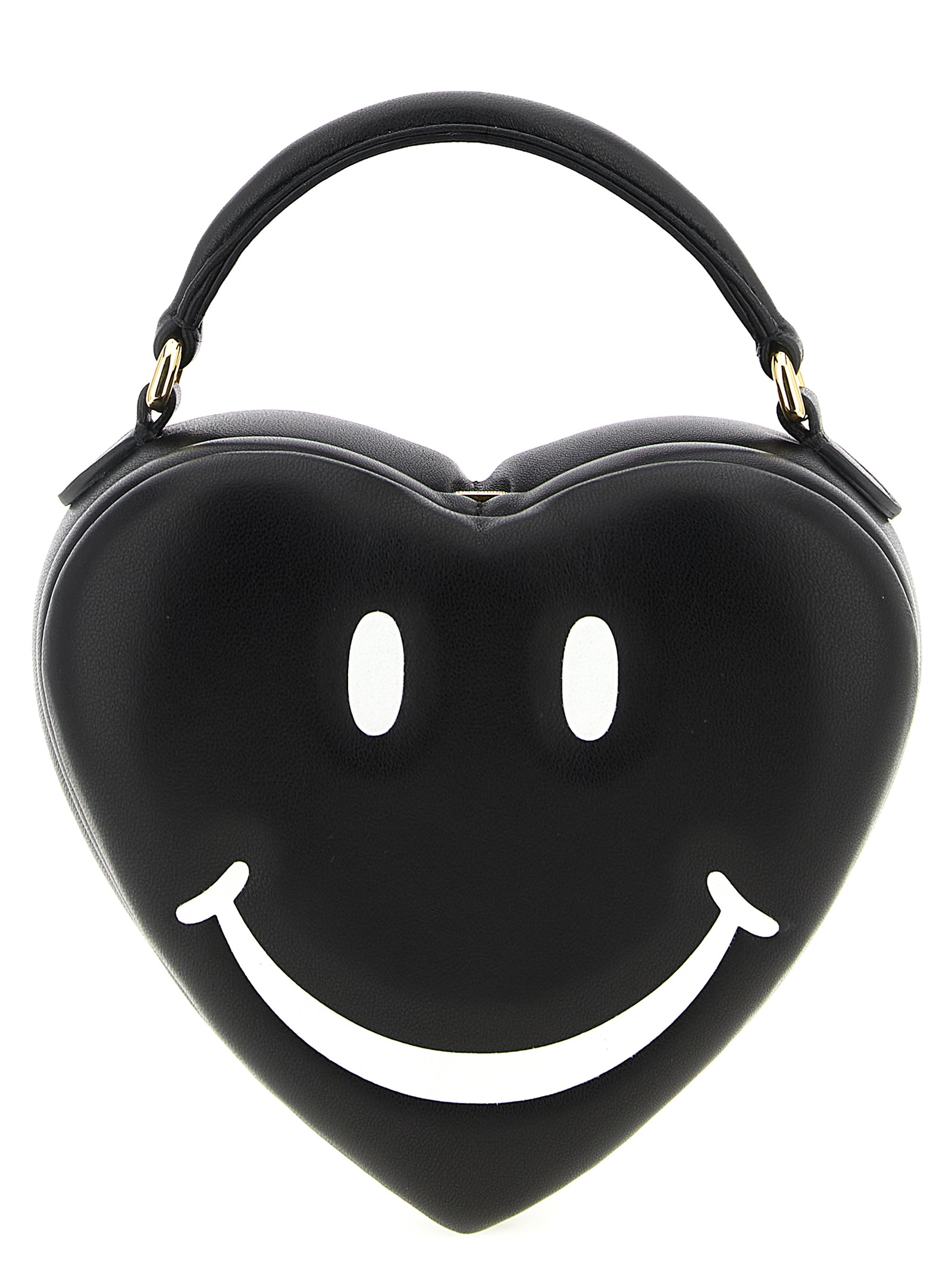 ‘Moschino Love Me’ nappa leather handbag padded with double-layer foam, heart shape with contrast embossed smile, back embossed logo, fixed handle, snap top opening, adjustable and removable shoulder strap._x000D_