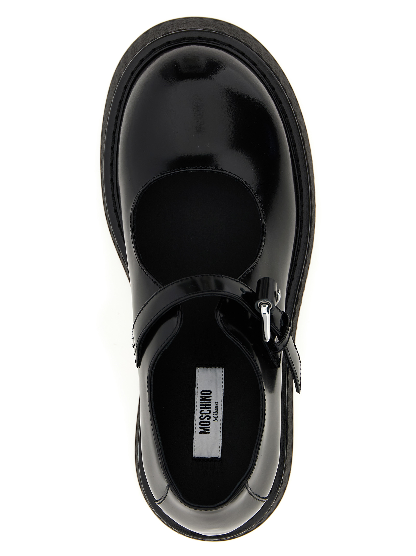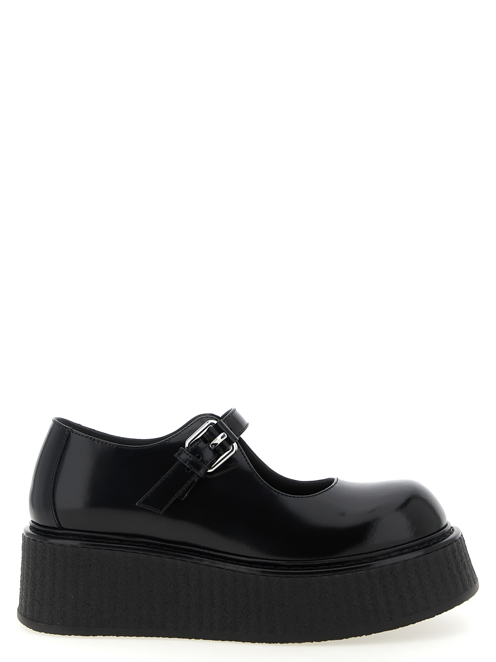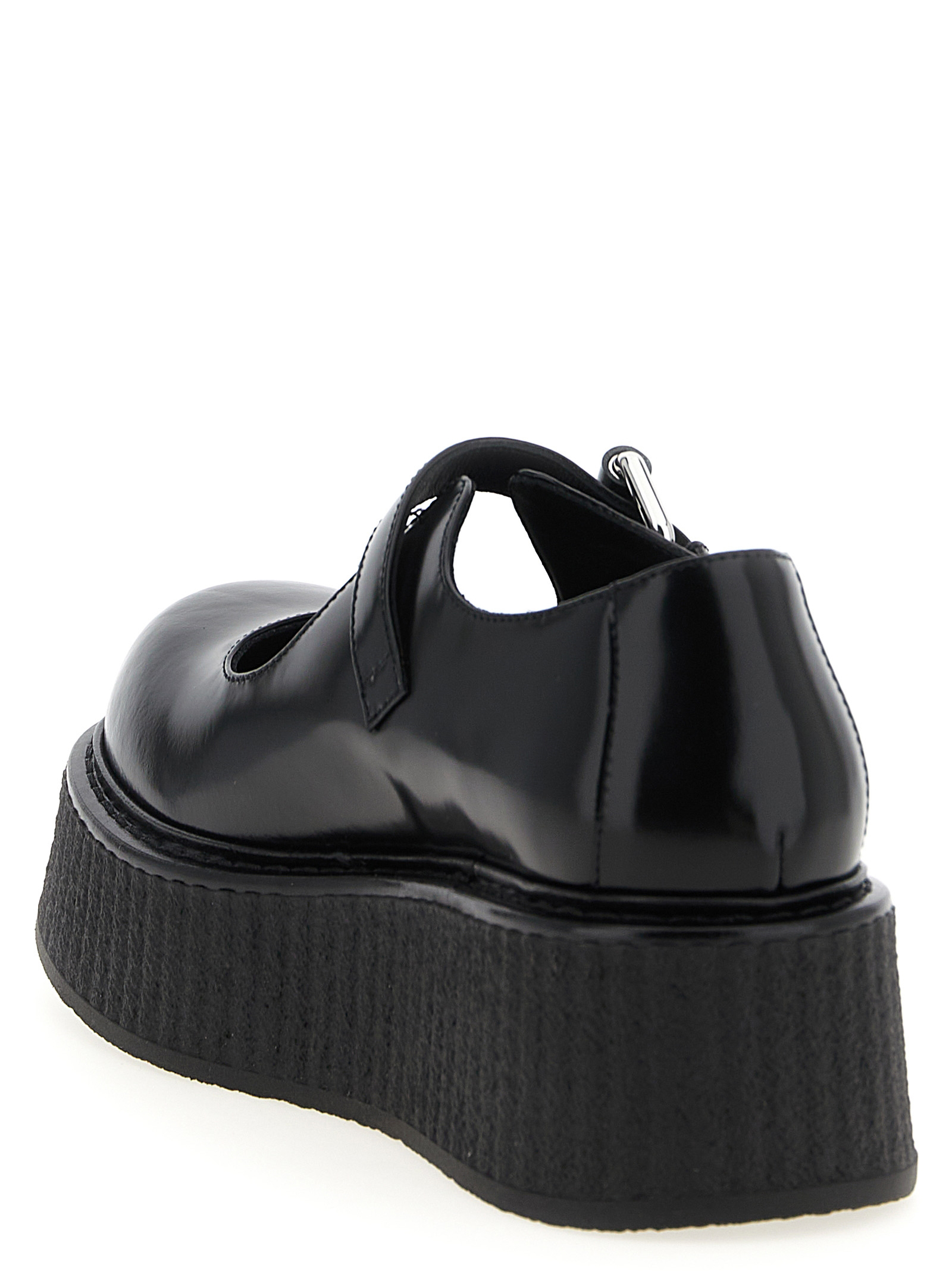 Mary Jane ‘Olivia’ in leather with adjustable strap, rounded toe, wedge covered in wavy crepe, rubber sole.