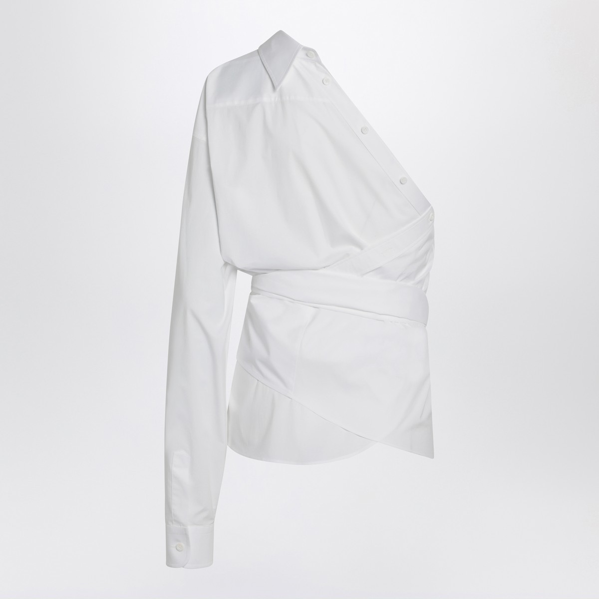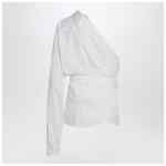 White cotton shirt by Moschino, characterized by one-shoulder design, long sleeve with button cuff, curved hem, an applied pocket on the chest, asymmetric design, and a waist sash.