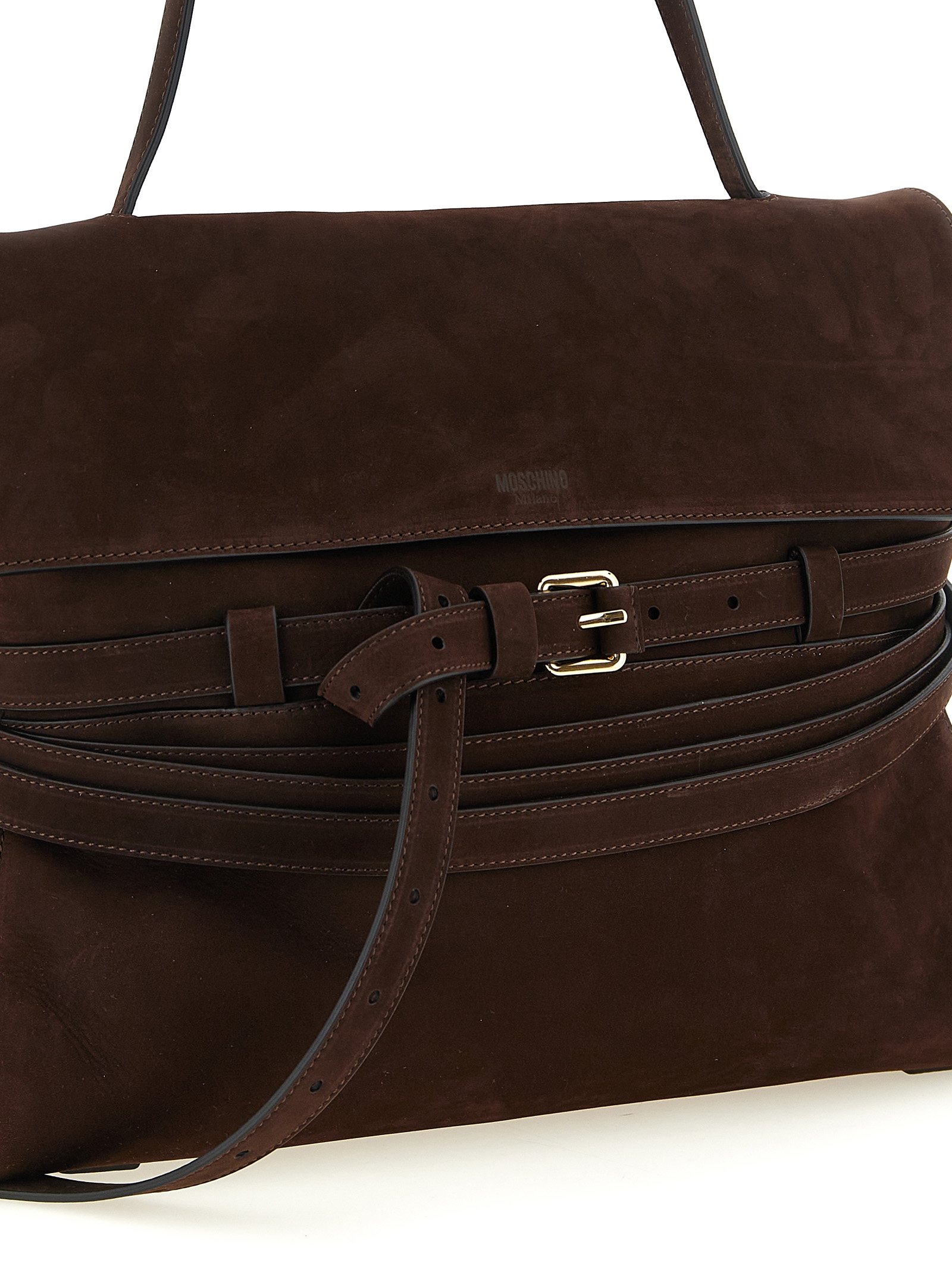Tie Me suede shoulder bag with front belt detail, front embossed logo, fixed handle, magnetic flap closure, adjustable and removable leather shoulder strap.