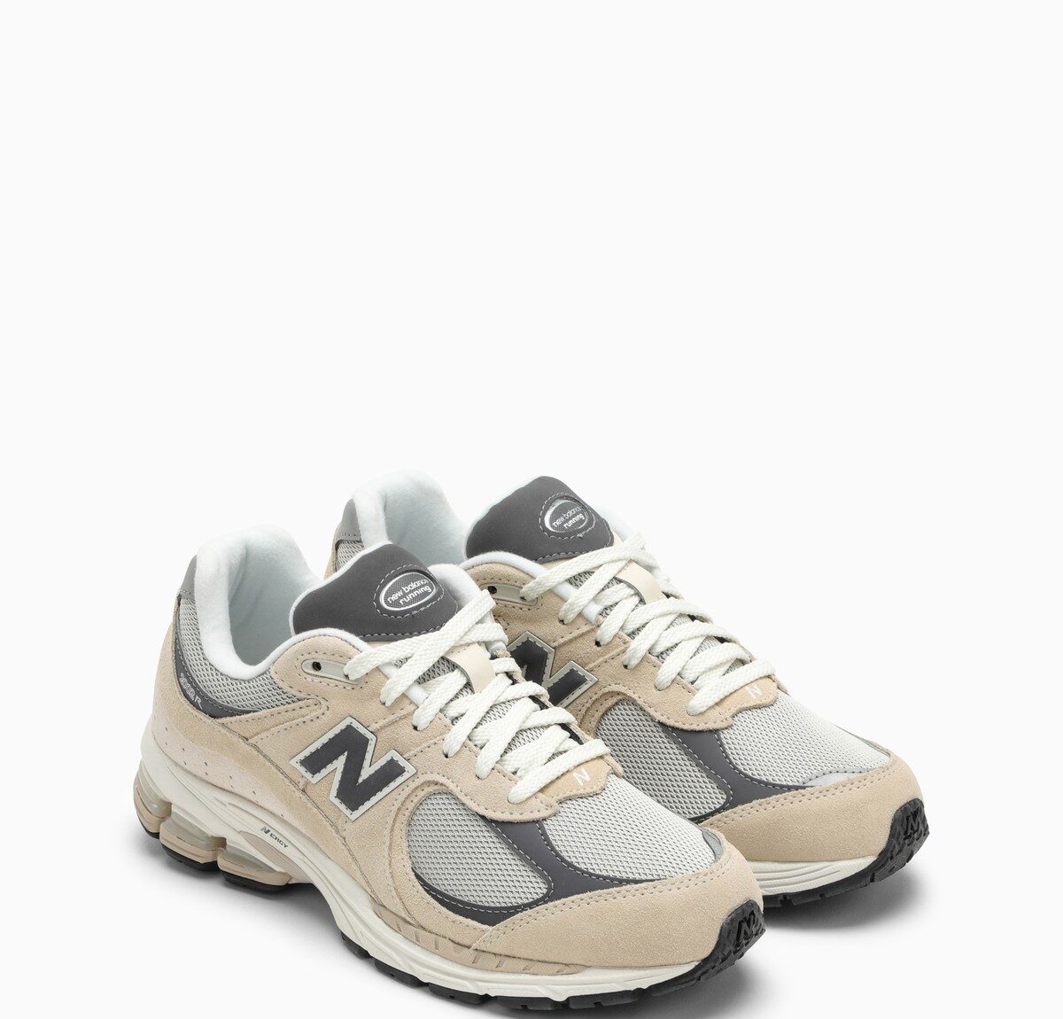 Low top sneakers by New Balance featuring beige and grey leather and mesh upper, contrasting details, round toe, lace-up closure, side N patch, rubber sole and branded tongue.