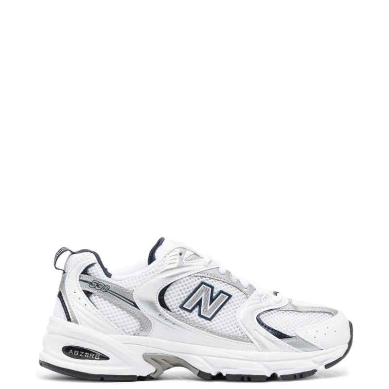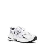 white/navy blue calf leather mesh panelling logo patch to the front logo-print tongue rear pull tab branded insole signature ABZORB® midsole ridged rubber sole 530 sneakers. Size and Fit – Please note this model is unisex, but the sizes refer to MEN sizing.