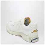 White leather and fabric low top trainer from New Balance featuring contrasting details, leather and mesh upper, round toe, lace-up closure, side N patch, rubber sole and branded tongue.