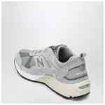 New Balance sneakers in gray fabric and leather, characterized by a round toe, lace-up closure, lateral N patch, rubber sole, and branded tongue.