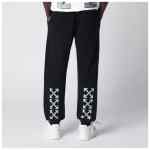 Off-White black cotton jogging trousers with elasticated waist and drawstring, two side pockets, elasticated ankles, heraldic arrow print on the back and contrasting logo lettering on the front.