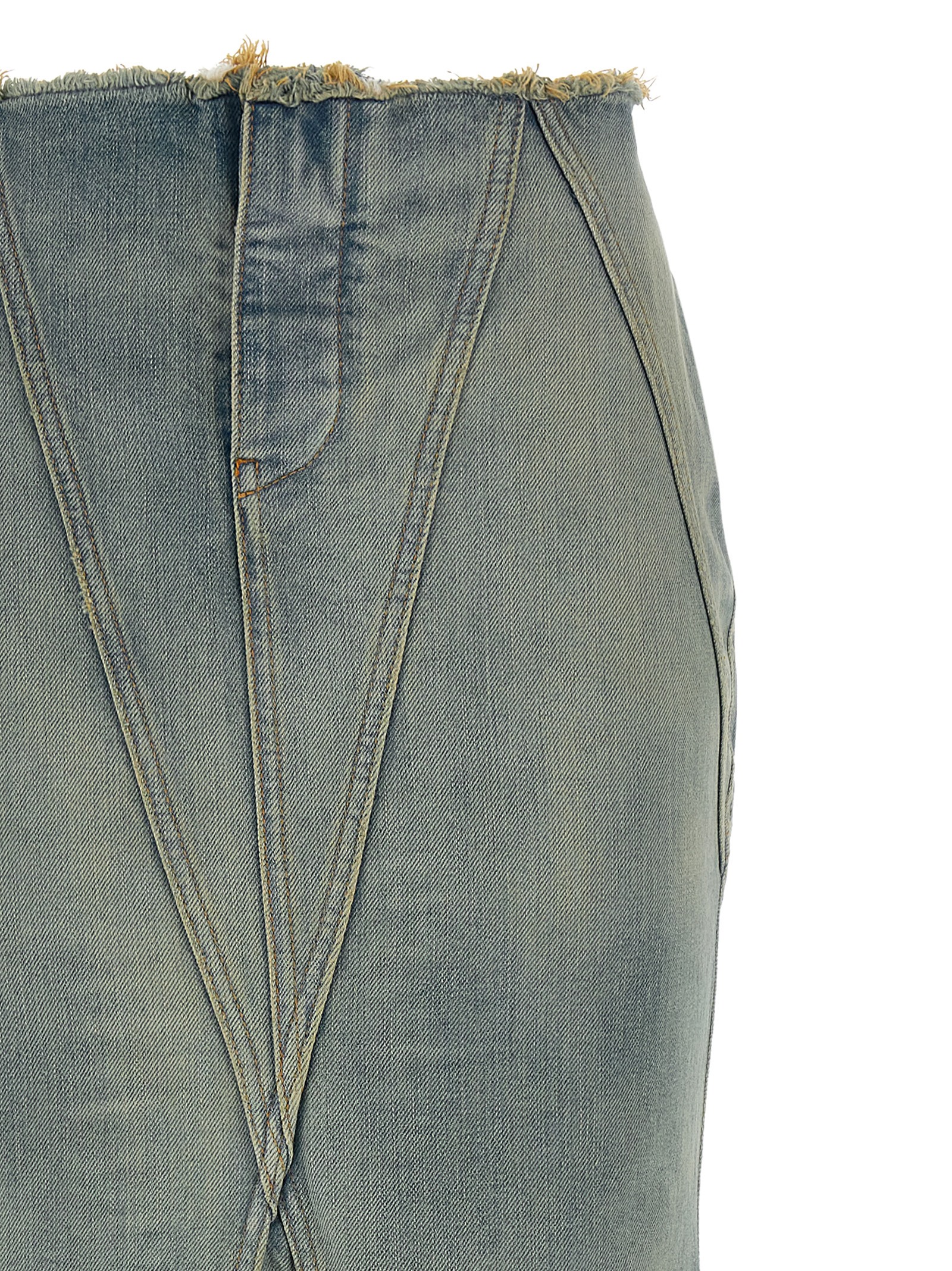 Long ‘Jane’ skirt in stonewashed cotton denim with used effect, fringes at the waist and on the hem, mermaid silhouette, front button closure, ‘Half Arrow’ print with vintage effect on the back, asymmetrical hem, unlined.