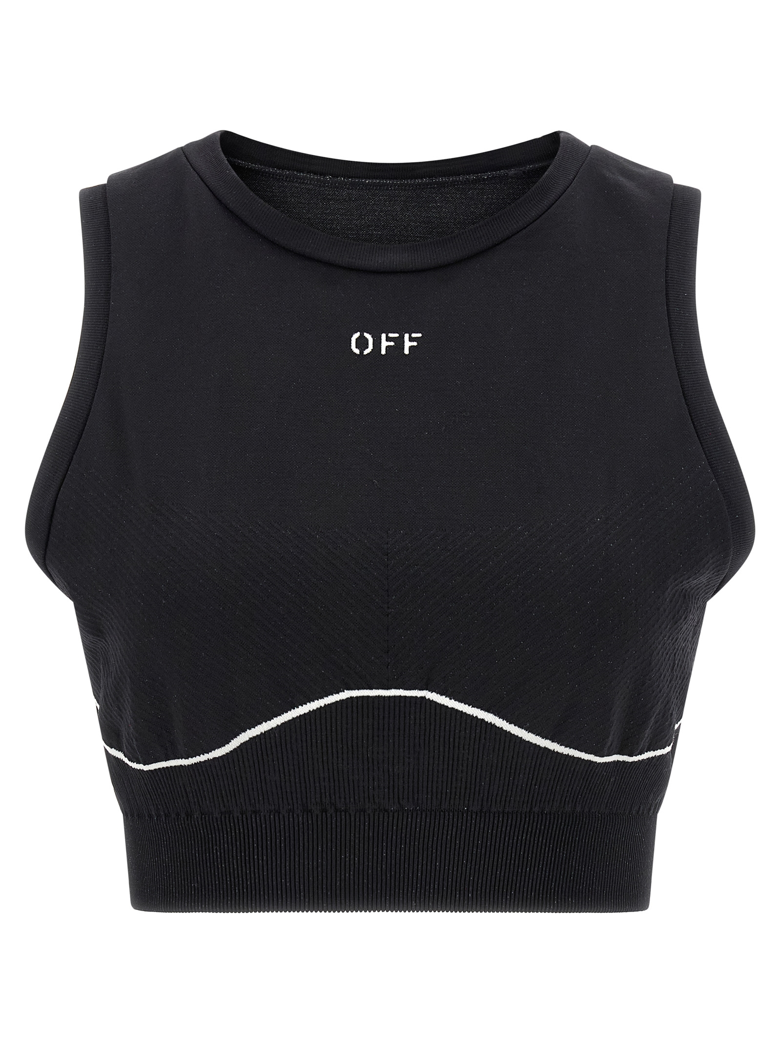 ‘off active’ line top in seamless stretch technical fabric, ‘off stamp’ logo intarsia on the front and back, Elastic band on the hem.