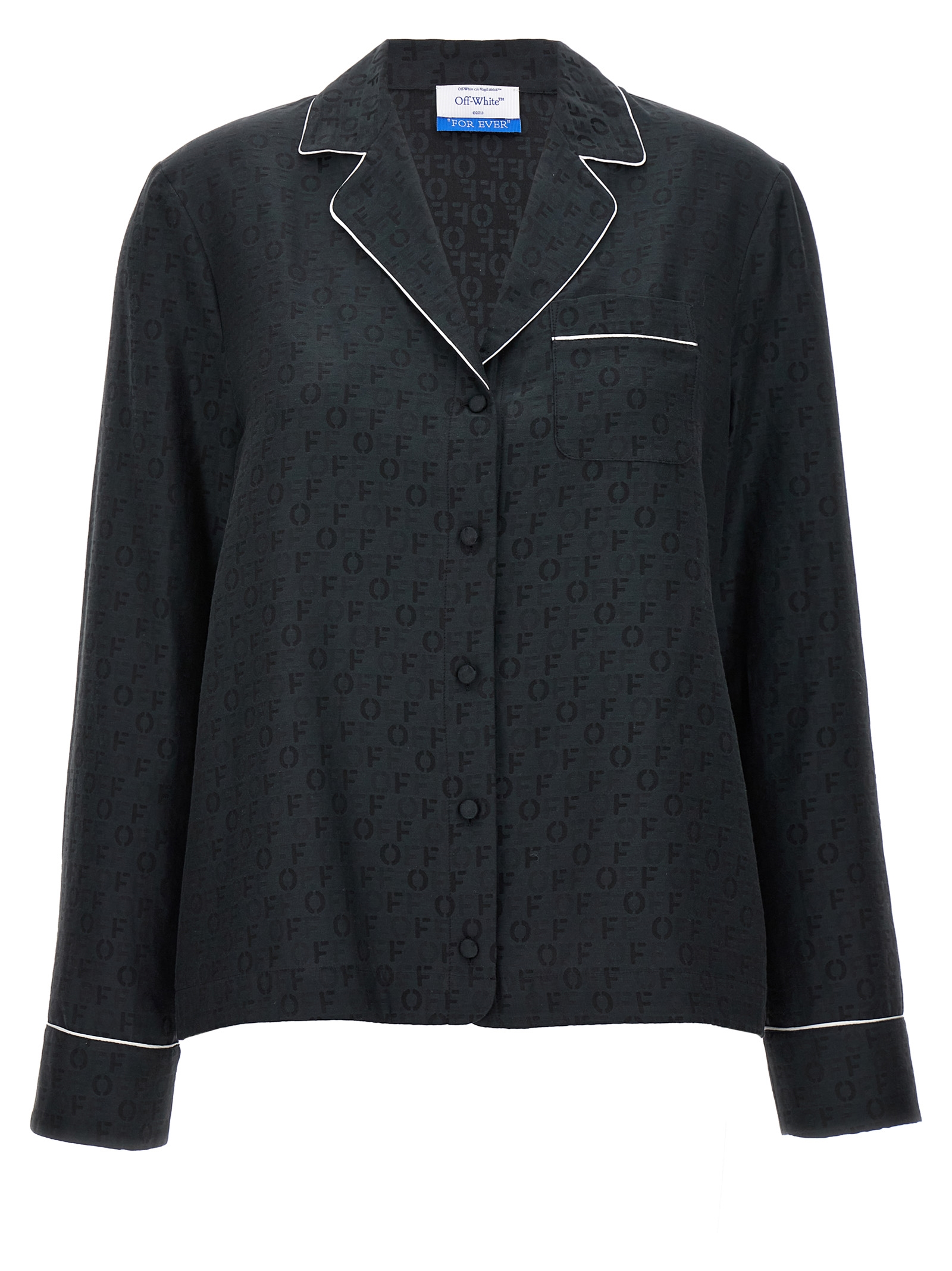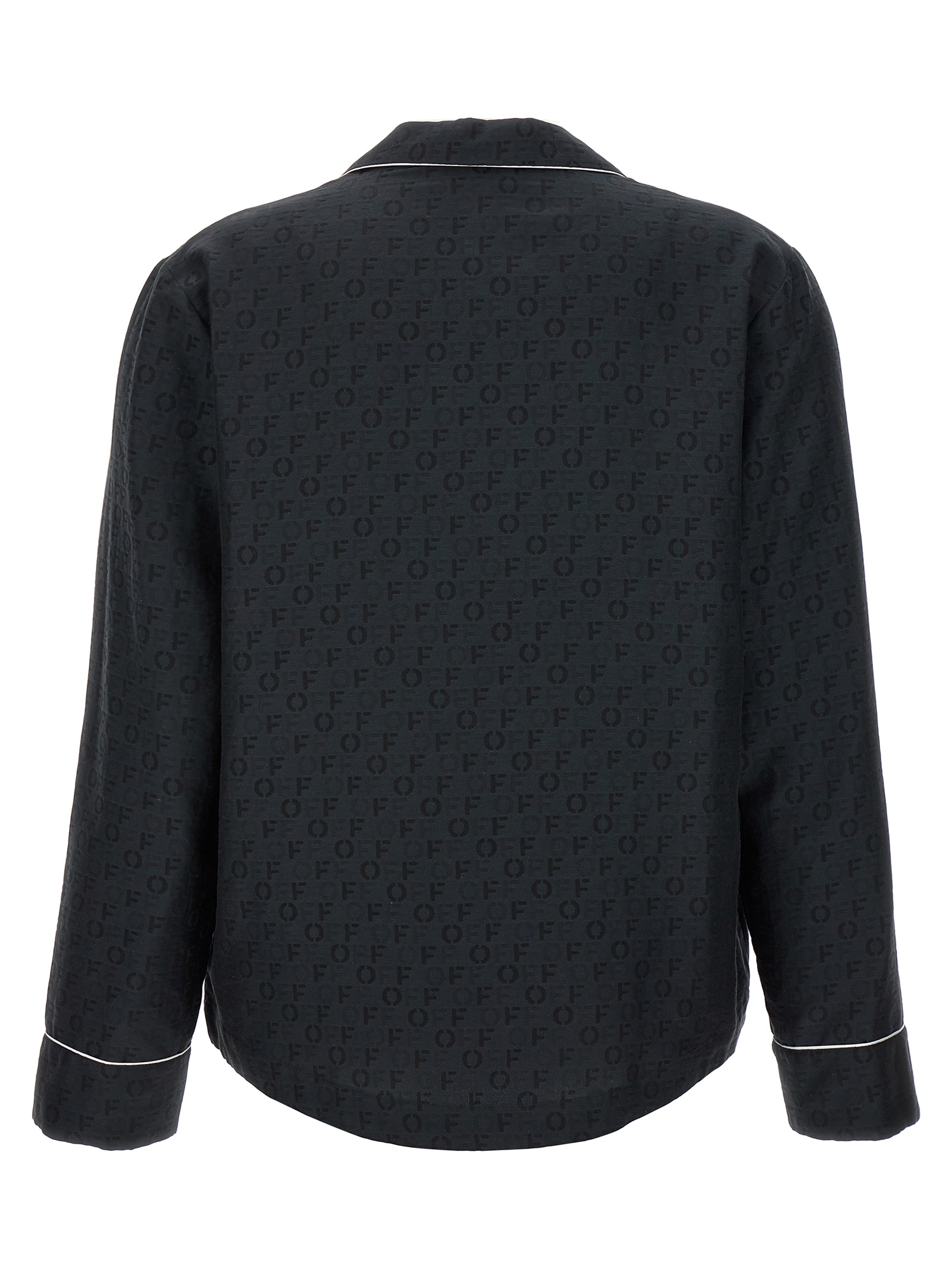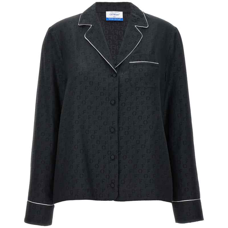 ‘off jaquard pajama’ silk and cotton blend shirt with all-over jacquard logo, Front pocket, Contrast piping, Button closure, Long sleeves. Size and Fit – True to size fit