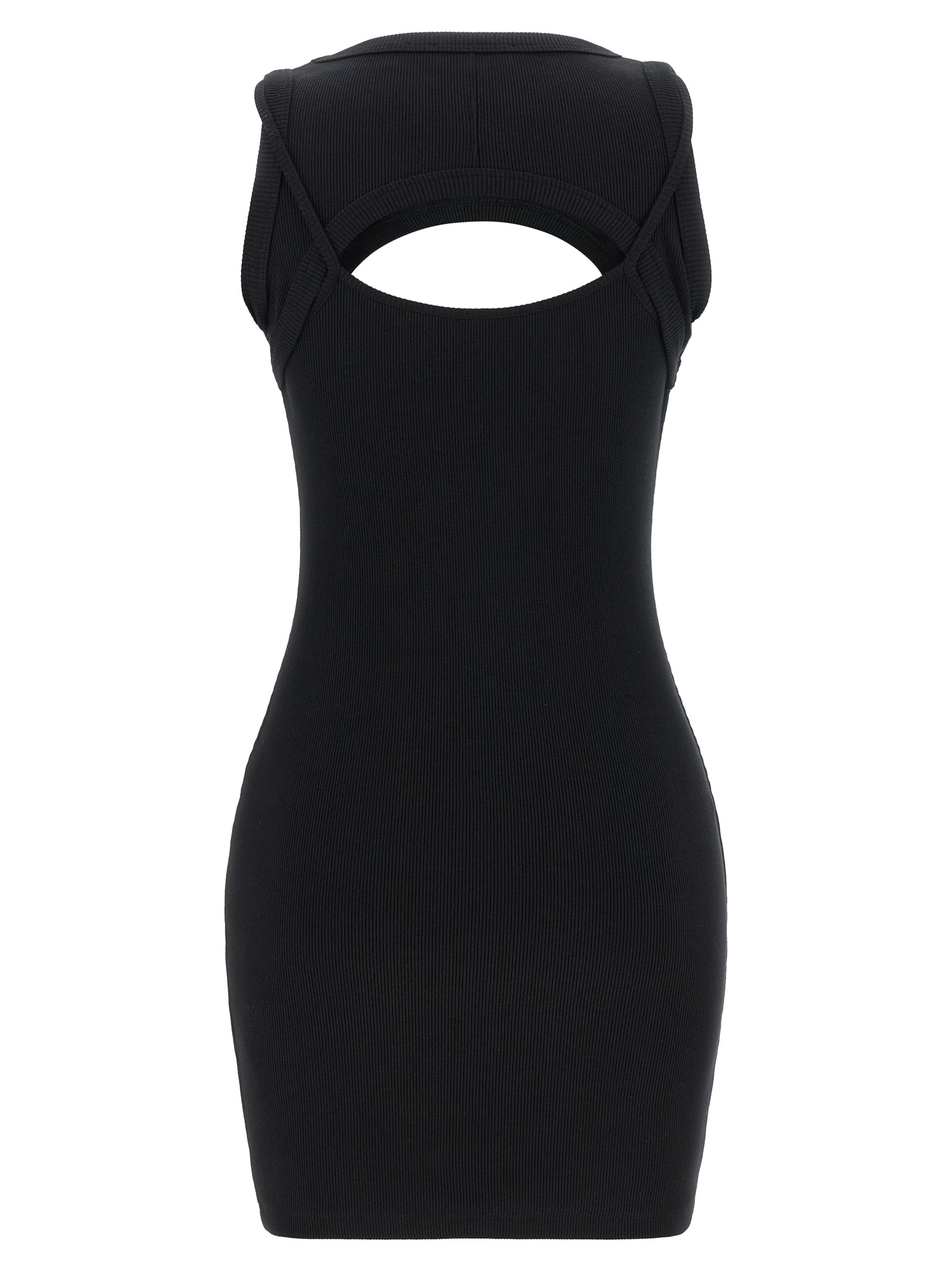 ‘off stamp’ ribbed stretch cotton mini dress with double layer upper part with crew neck insert with contrasting logo embroidery, Thin straps, Sleeveless, Round neckline. Size and Fit – Slim fit