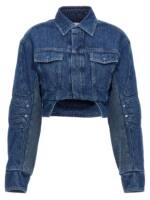 ‘motorcycle’ cropped denim jacket with asymmetric waist, Concealed priced button closure and a 3d finish. Size and Fit – cropped fit.