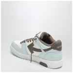 Off-White sneakers in smooth white, light blue, and brown leather, featuring Arrows motif, logo heel counter, branded lace-up closure, Zip Tie logo tag, perforated round toe, and rubber sole.