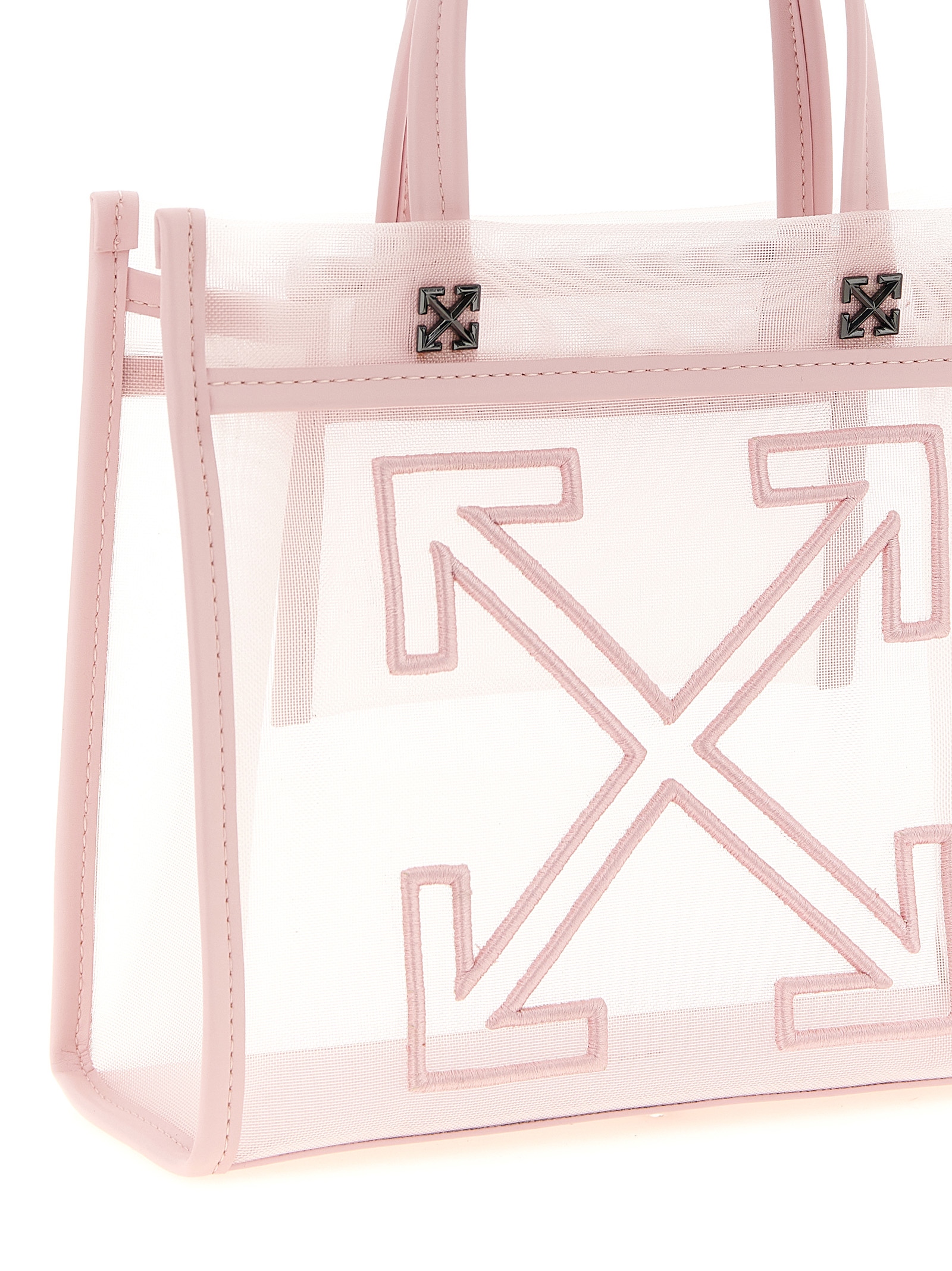 Small ‘market’ mesh shopping bag semi-transparent mesh and tone-on-tone smooth leather, Tote style with tone-on-tone embroidery and metal details with front ‘arrow’ pattern, Double fixed handle, And inner pocket. Size and Fit – W 24 x h 20 x d 10 cm